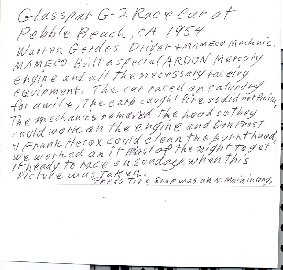Glasspar G2 race car at Pebble Beach, California 1953 (corrected). Warren Gerdes driver and Mameco Mechanic (Ed Martindale). Mameco built a special Ardun Mercury engine and all the necessary racing equipment.