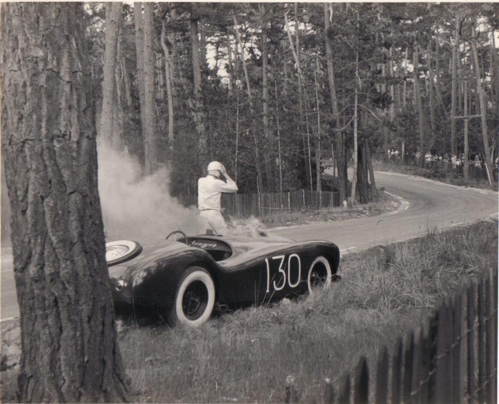 Thanks to the efforts of others in our group, in this case the Tritt family and Mike Wittman, we have additional pictures of that race taken back in 1953. Below are two pictures. The first was taken by Mike Wittman at the start of the Pebble Beach race. The second picture was taken on the last lap of the race on Saturday – just as Warren Gerdes got out of his racecar, but before the fire crew arrived to put out the fire. This picture is from the collection of the Tritt family.