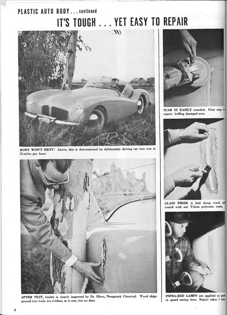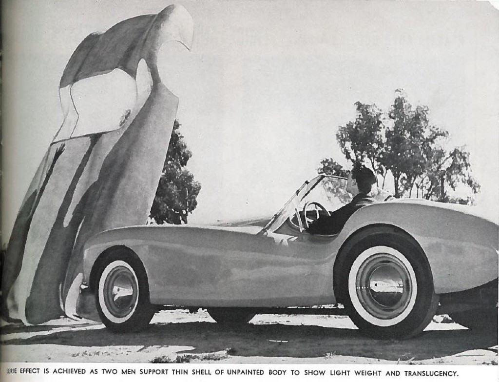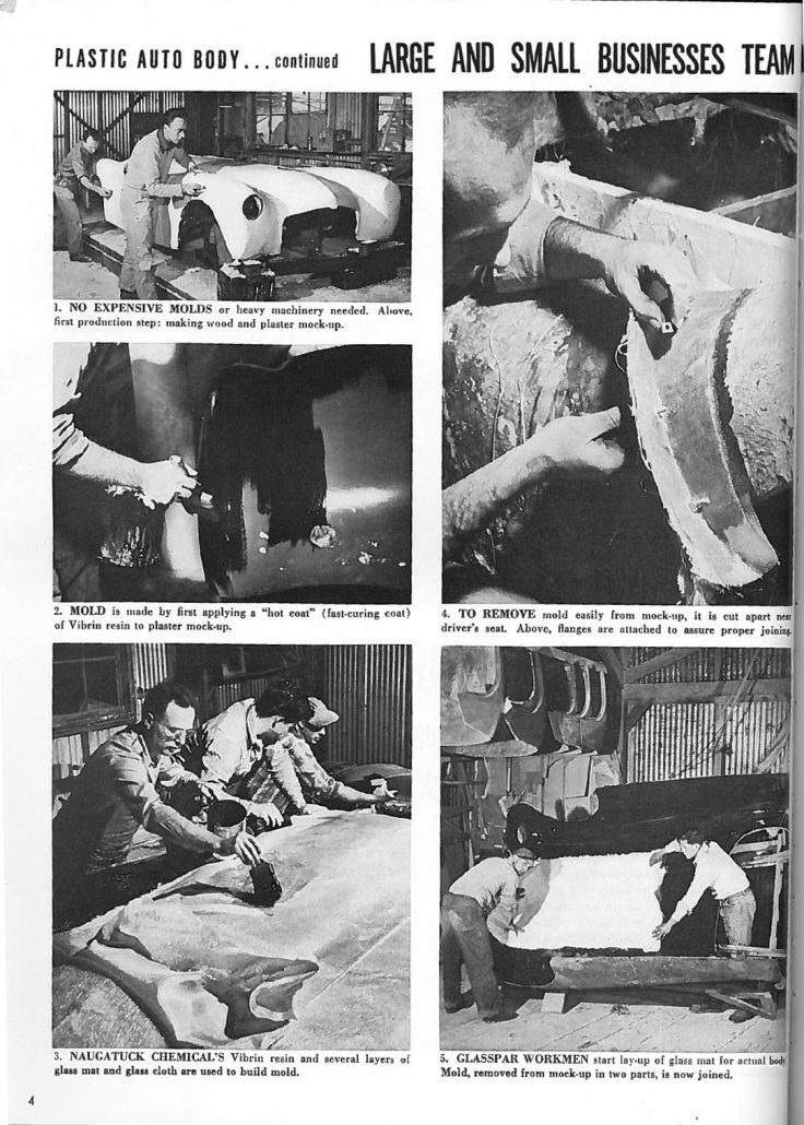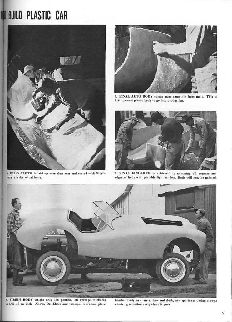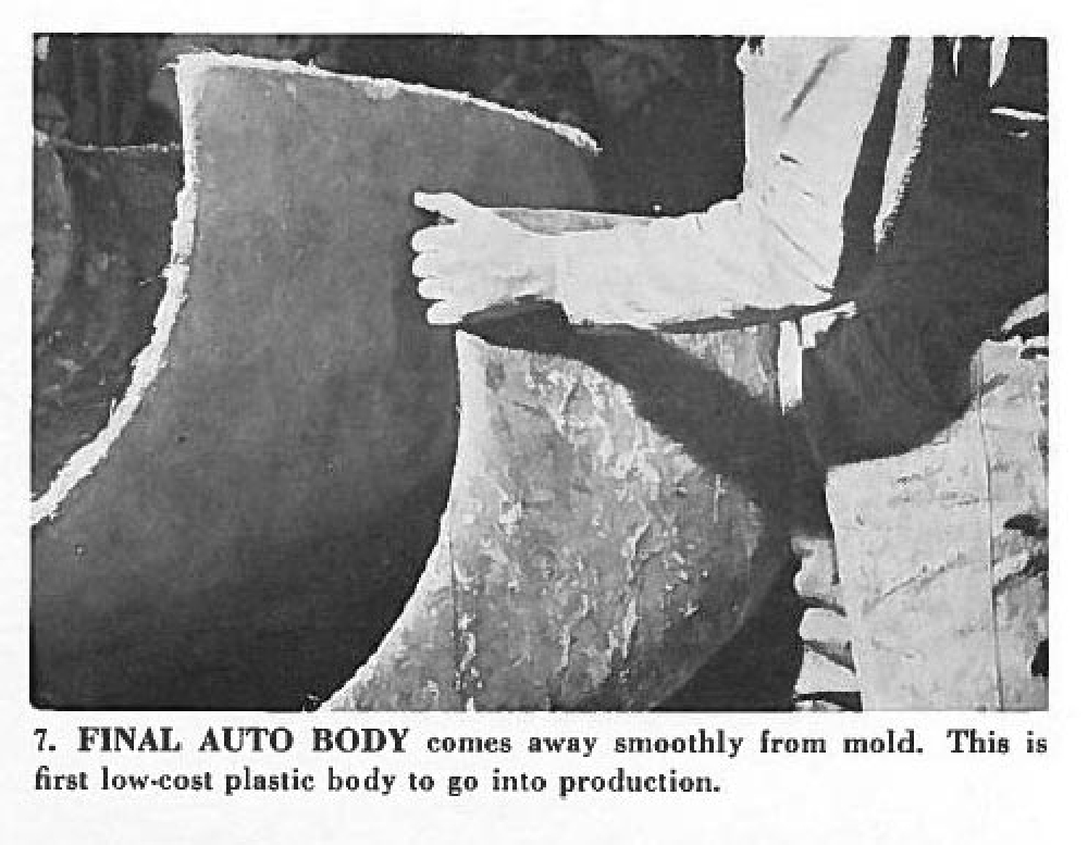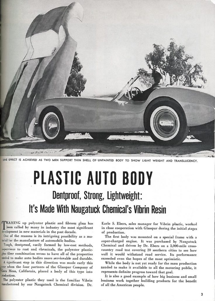 Tough, dent-proof, easily formed by low-cost methods, impervious to rust and chemicals, the polyester plastic-glass fiber combination seems to have all of the properties needed to make auto bodies more serviceable and durable. A significant step in this direction was made early this year when the four partners of the Glasspar Company of Costa Mesa, California, placed a body of this type into production.