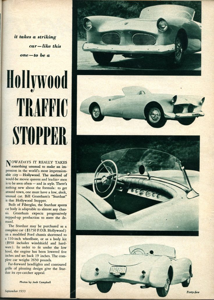 Nowadays it really takes something unusual to make an impression in the world’s most impressionable city – Hollywood. The method of would-be movie queens and leading men is to be seen often – and in style. There’s nothing new about the formula: to get around town, one must have a low, sleek, unusual car. Bill Grantham’s “Stardust is that Hollywood Stopper.