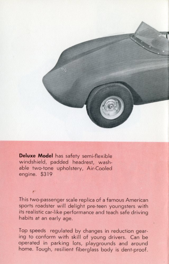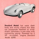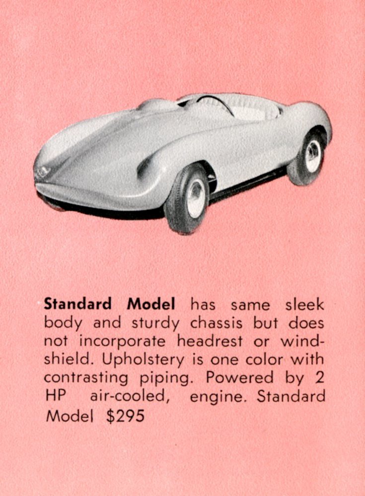 • Standard Model:  Has same sleek body and sturdy chassis but did not incorporate headrest or windshield.  Upholstery is one color with contrasting piping.  Powered by 2 horsepower air-cooled engine.  Standard model cost $295.