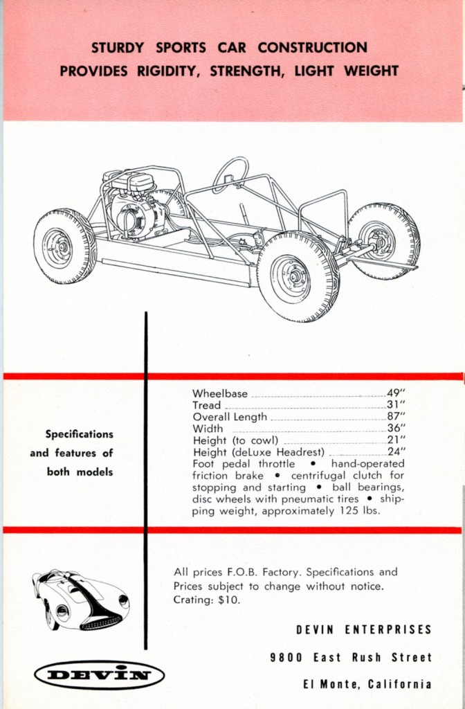 1. When I was 10 or 12 years old we drove to San Gabriel, California in I think 1964 and my Uncle, Bill Burke gave me a go kart. It had a fiberglass sports car body on it. I still have the car. It looks in many ways to be a Devin Jr body. The chassis is different from the Devin Jr chassis. I am trying to find out if Bill Burke, one of The Fathers of Fiberglass build the original molds for the Devin Jr. If anyone knows more about this I would sure appreciate any information. My friends and I spent many hours driving it and even flipped it once with 2 of us in the car. No one was hurt. I heard Bil Burke made 6 or 8 of the Devin bodys. I have a 3 1/2 Briggs in it. It runs General Jumbo Jr. Tires. Many years ago I wrote General to tell them about running their tires. They never wrote back. A cloverleaf tread on the rears and ribbed fronts. When I restored the chassis the tires had never had a puncture. I run Chen Shing tires so as not to wear out the originals.