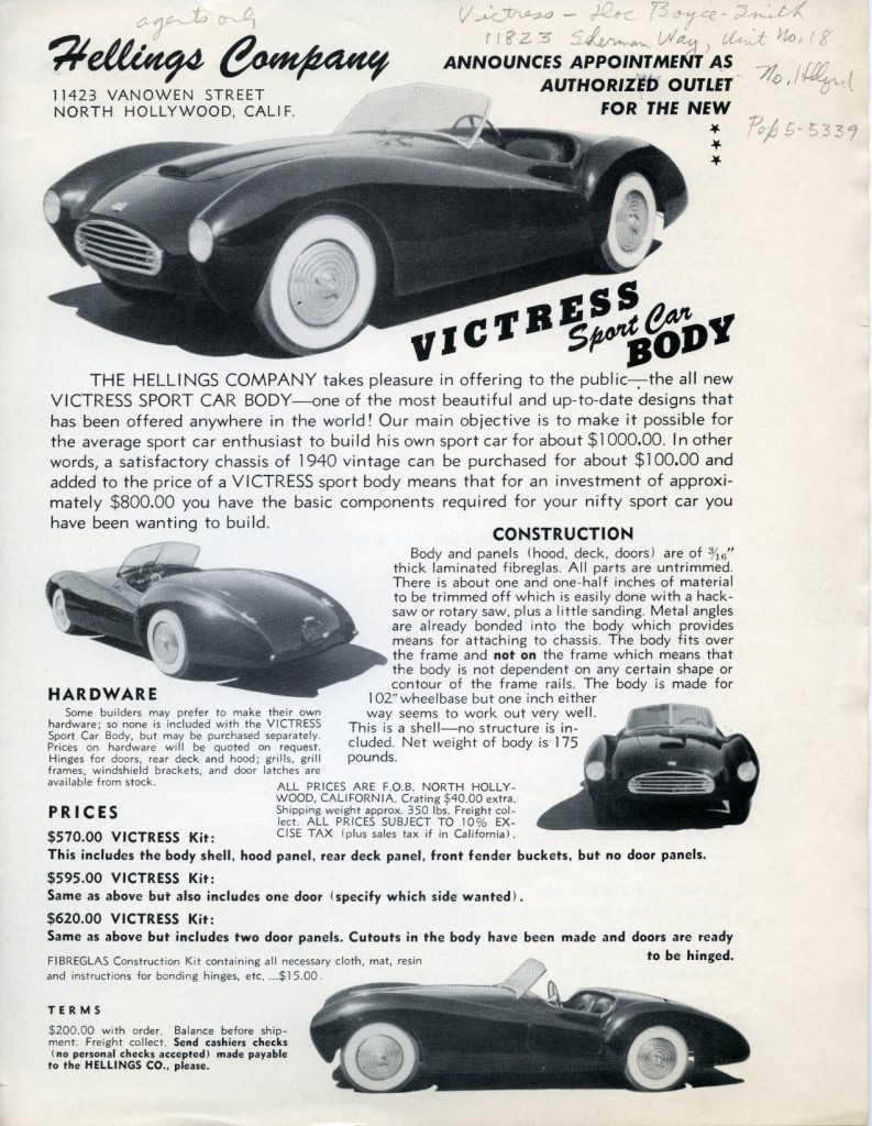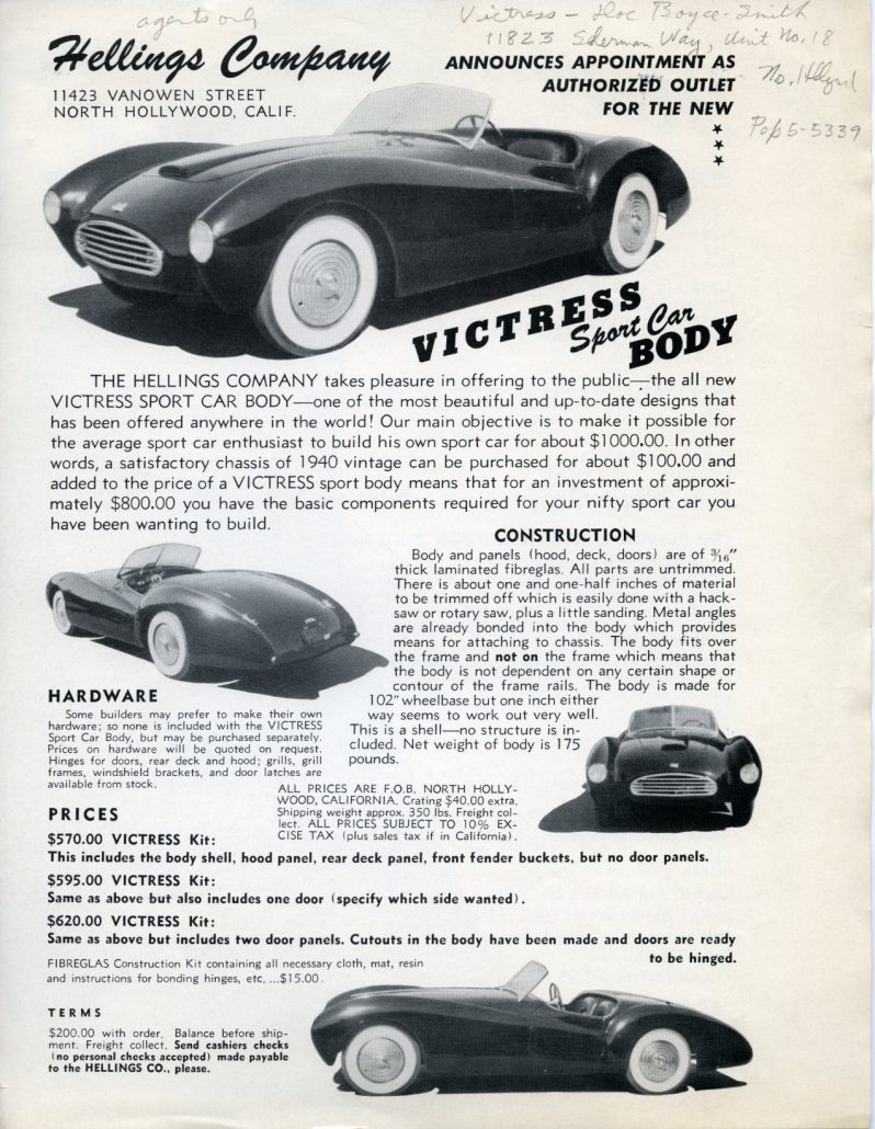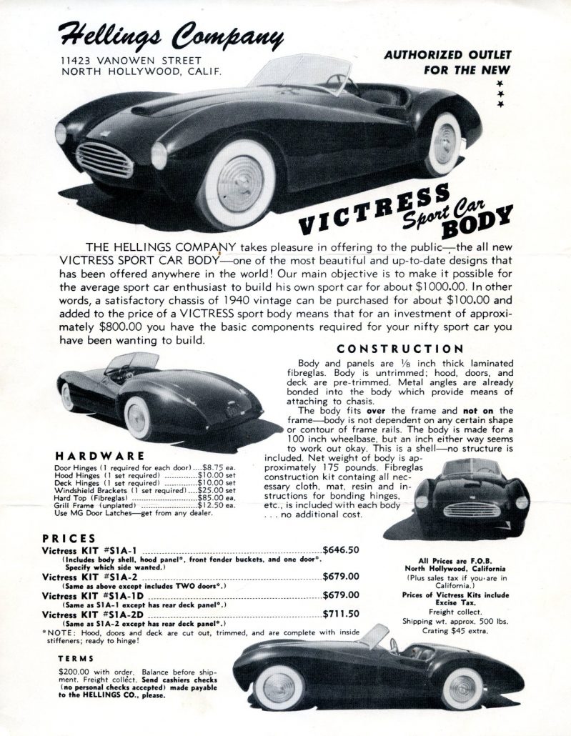 - Prices increased in about a year. All Victress Sports Car Bodies now had at least one door, but the rear deck/trunk was optional