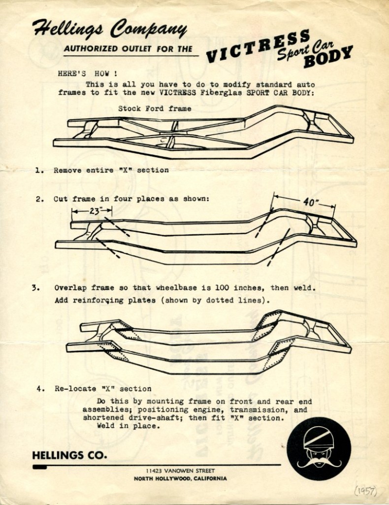 Here the folks at Hellings (most likely Virgil Rice) showed you how to change a stock Ford frame into a lowered chassis for use with the Victress S1 body. There were 4 basics steps, and these are shown below. The only step that was discussed but not illustrated was the last step where the “X” section was fit back in and welded into place. This is not shown in the flyer.