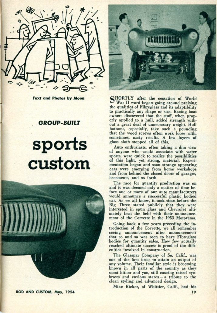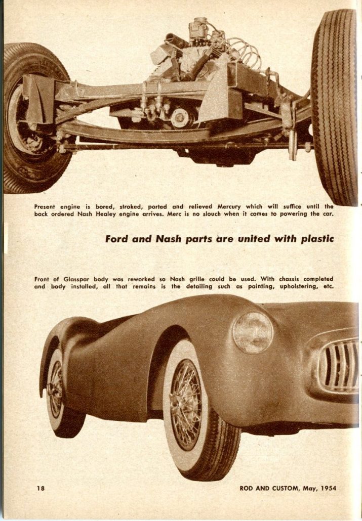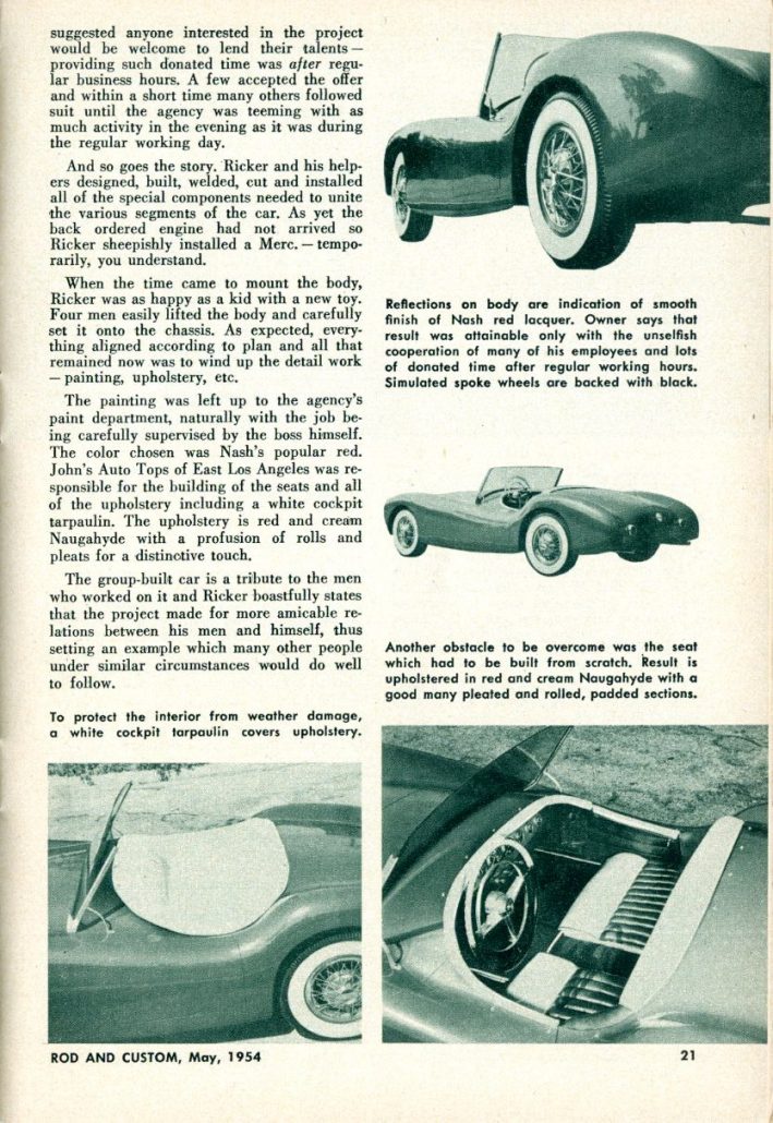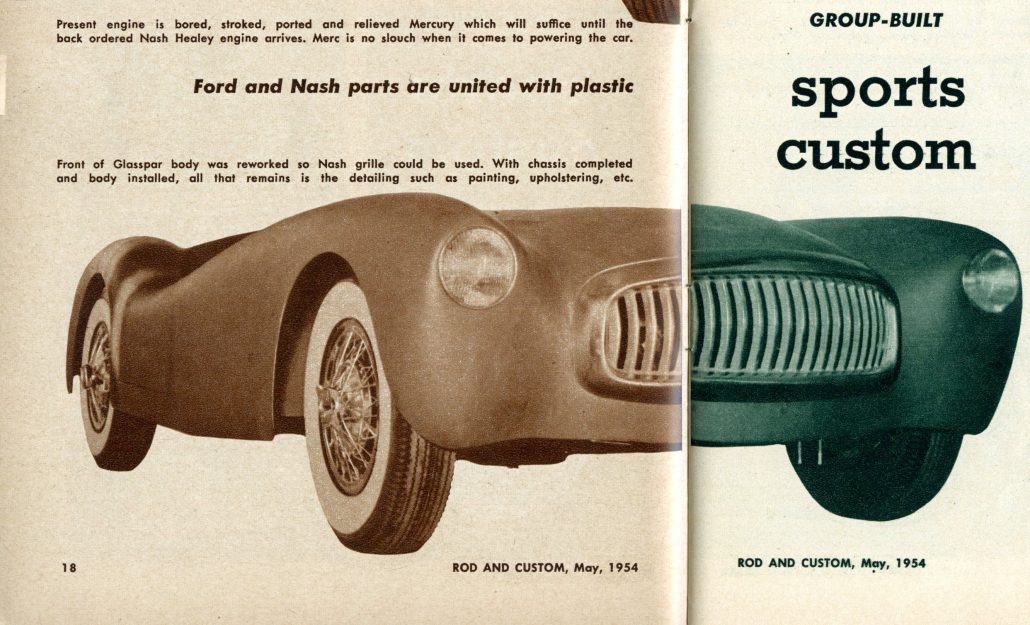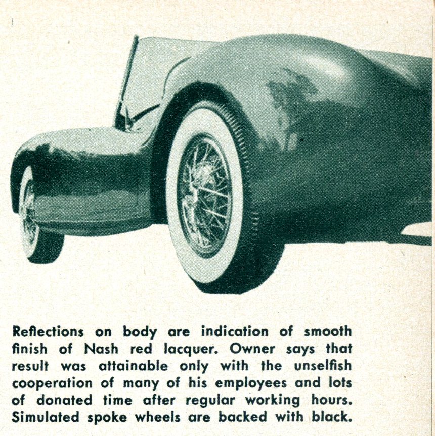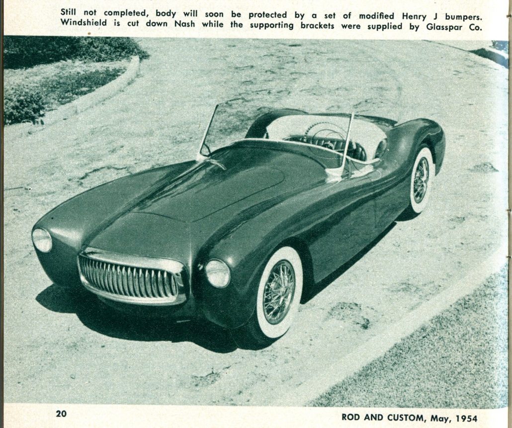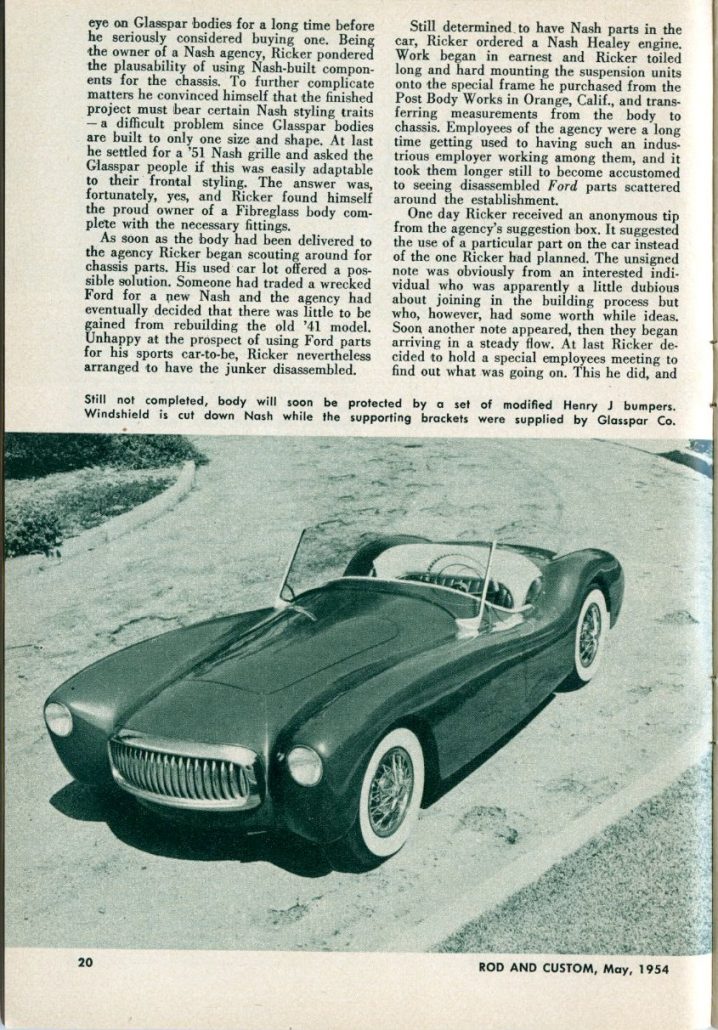 Mike Ricker, of Whittier, California, had his eye on Glasspar bodies for a long time before he seriously considered buying one. Being the owner of a Nash agency, Ricker pondered the plausibility of using Nash-built components for the chassis. To further complicate matters, he convinced himself that the finished project must bear certain Nash styling traits – a difficult problem since Glasspar bodies are built to only one size and shape.