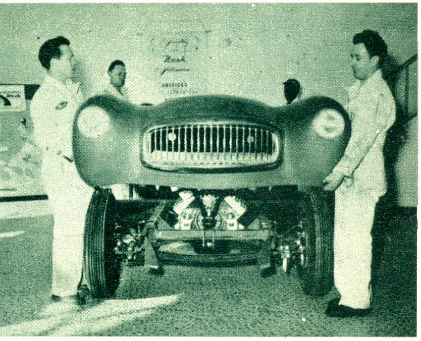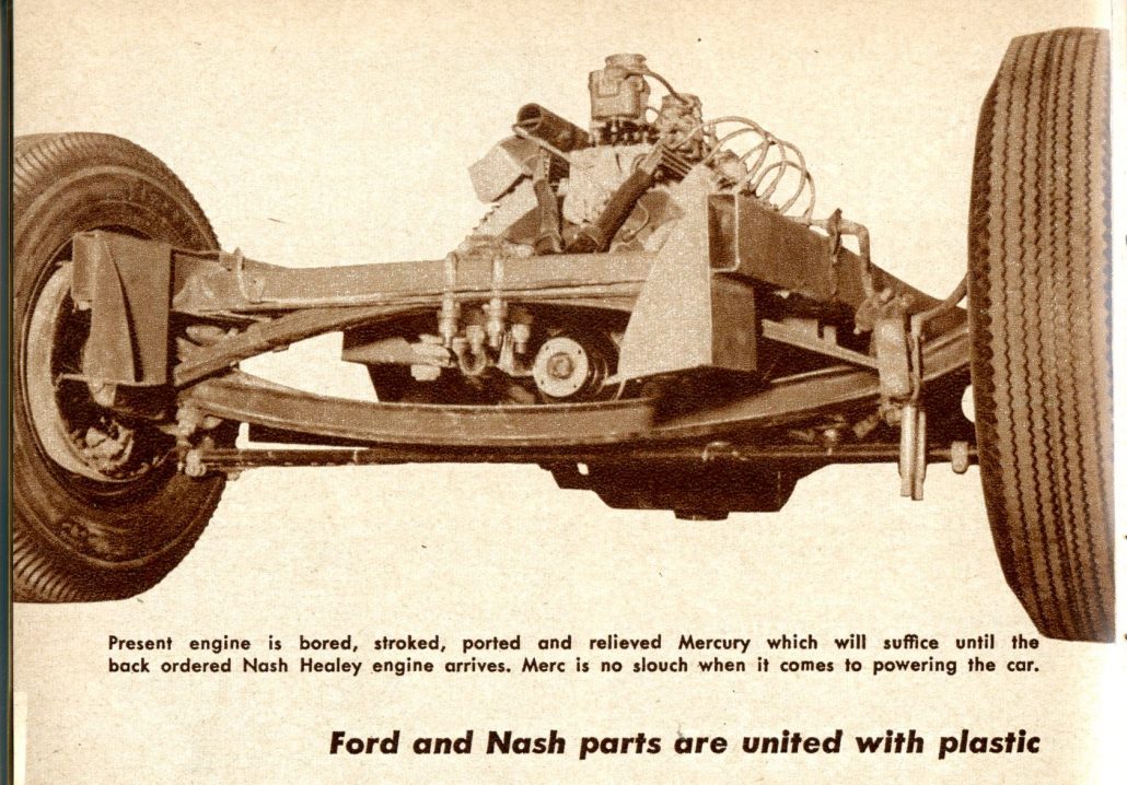 Unhappy at the prospect of using Ford parts for his sports car-to-be, Ricker nevertheless arranged to have the junker disassembled. Still determined to have Nash parts in the car, Ricker ordered a Nash Healey engine. Work began in earnest and Ricker toiled long and hard mounting the suspension units onto the special frame he purchased from the Post Body Works in Orange, California, and transferring measurements from the body to the chassis.