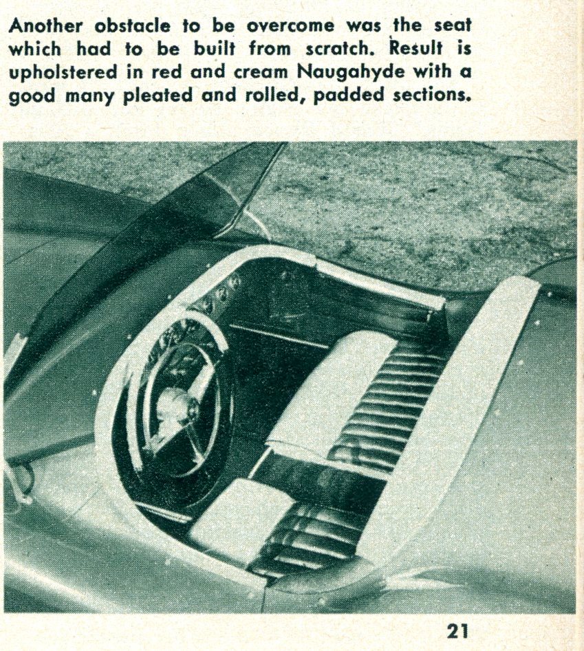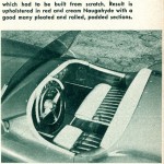 The upholstery is red and cream Naugahyde with a profusion of rolls and pleats for a distinctive touch. The group-built car is a tribute to the men who worked on it and Ricker boastfully states that the project made for more amicable relations between his men and himself, thus setting an example which many other people under similar circumstances would do well to follow.