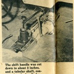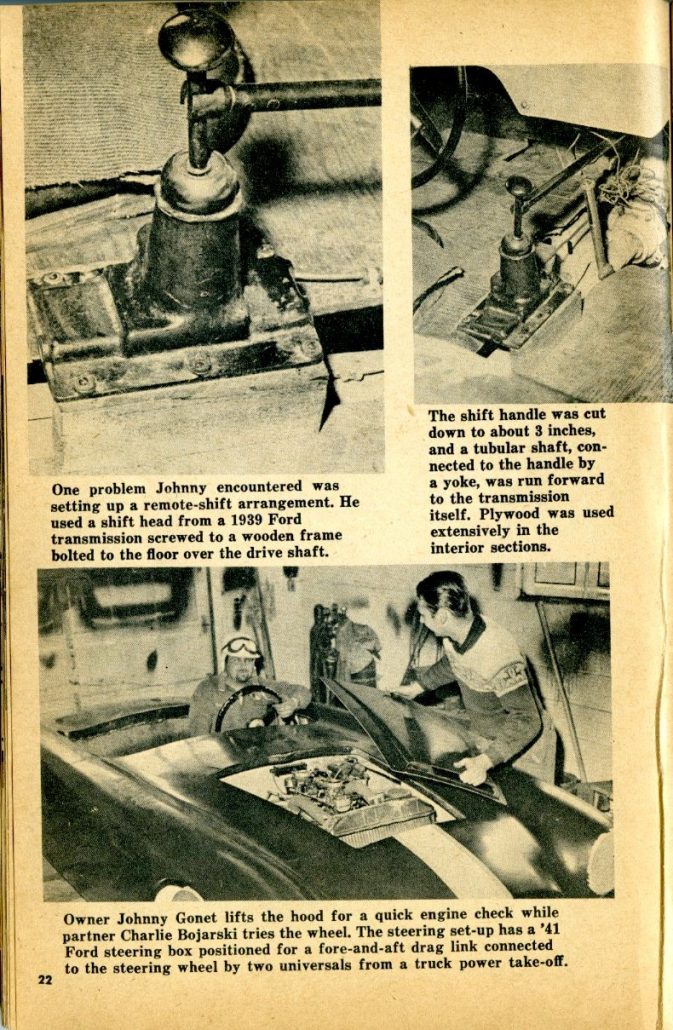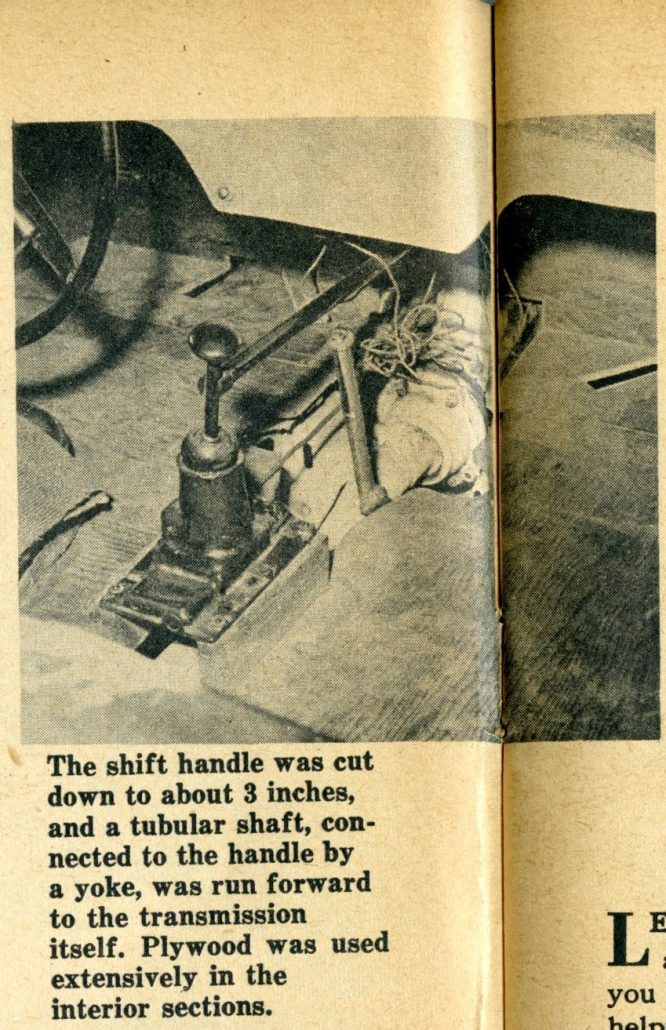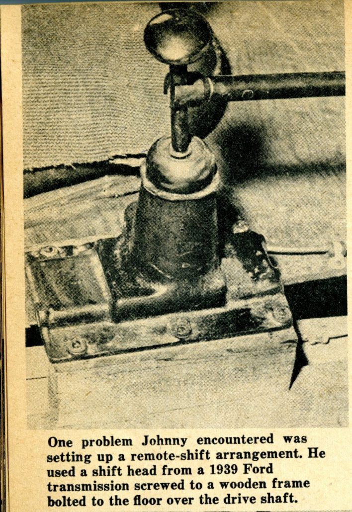 - Caption: One problem Johnny encountered was setting up a remote-shift arrangement. He used a shift head from a 1939 Ford transmission screwed to a wooden frame bolted to the floor over the drive shaft.