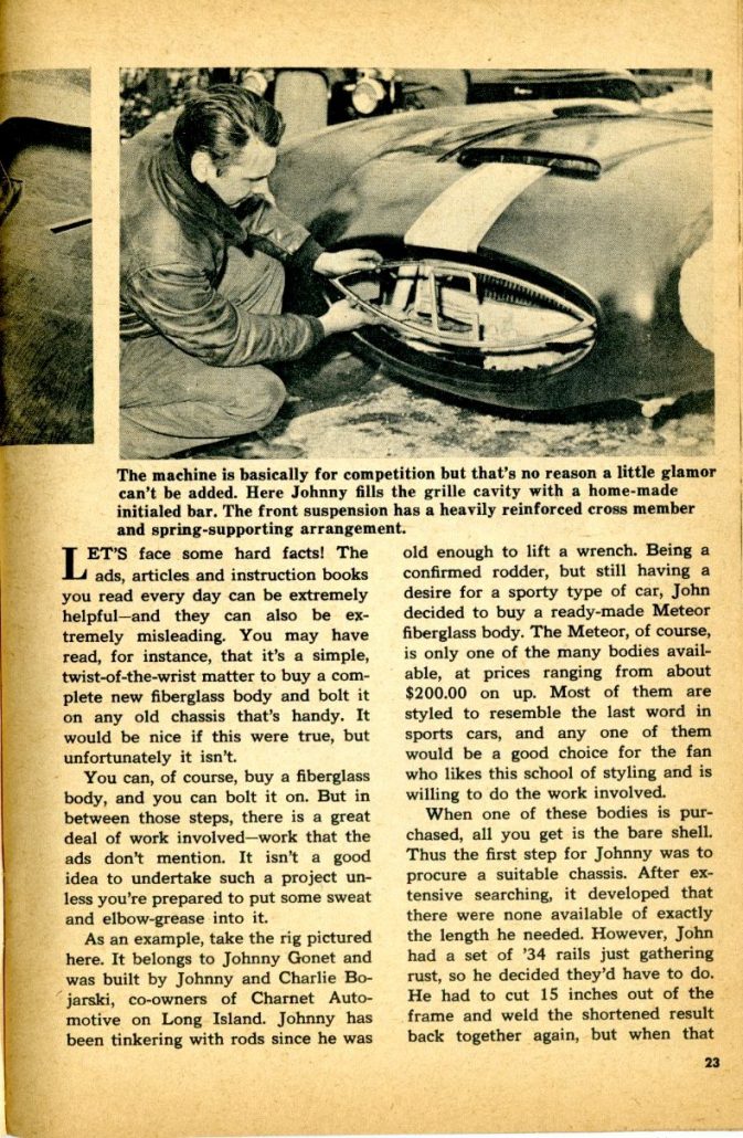 As an example, take the rig pictured here. It belongs to Johnny Gonet and was built by Johnny and Charlie Bojarski, co-owners of Charnet Automotive on Long Island. Johnny has been tinkering with rods since he was old enough to lift a wrench. Being a confirmed rodder, but still having a desire for a sporty type of car, John decided to buy a ready-made Meteor fiberglass body.