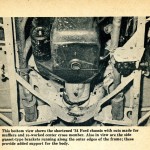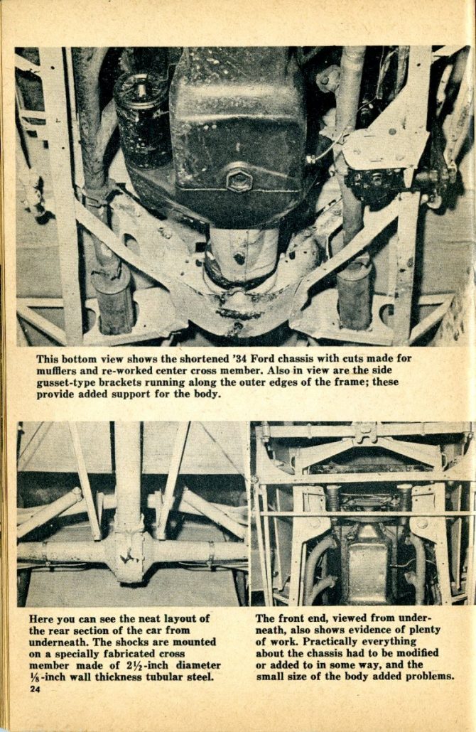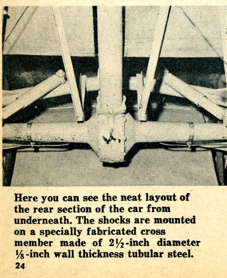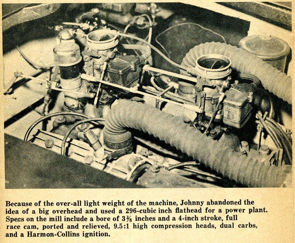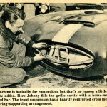 - Caption: The machine is basically for competition but that’s no reason a little glamor can’t be added. Here Johnny fills the grille cavity with a home-made initialed bar. The front suspension has a heavily reinforced cross member and spring-supporting arrangement.