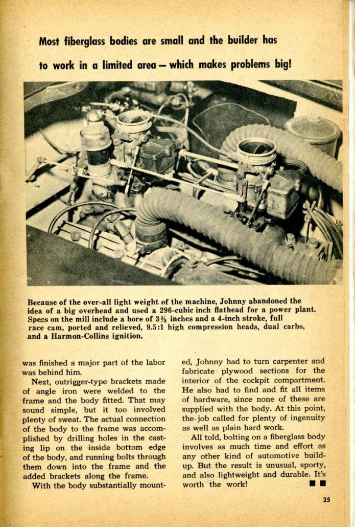 What a great story that really showed us what it was like to build what Rick D’Louhy and I call a “Generation 1: 1951-1956) fiberglass sports car, back in the 1950’s. The pictures are spot on and give you close-ups of key parts of the build and the challenges they had in putting it all together. And as I mentioned before, it’s neat to see one of these documented and built on the East Coast. This magazine is also an East Coast product, so they were covering “one of their own” – so to say.