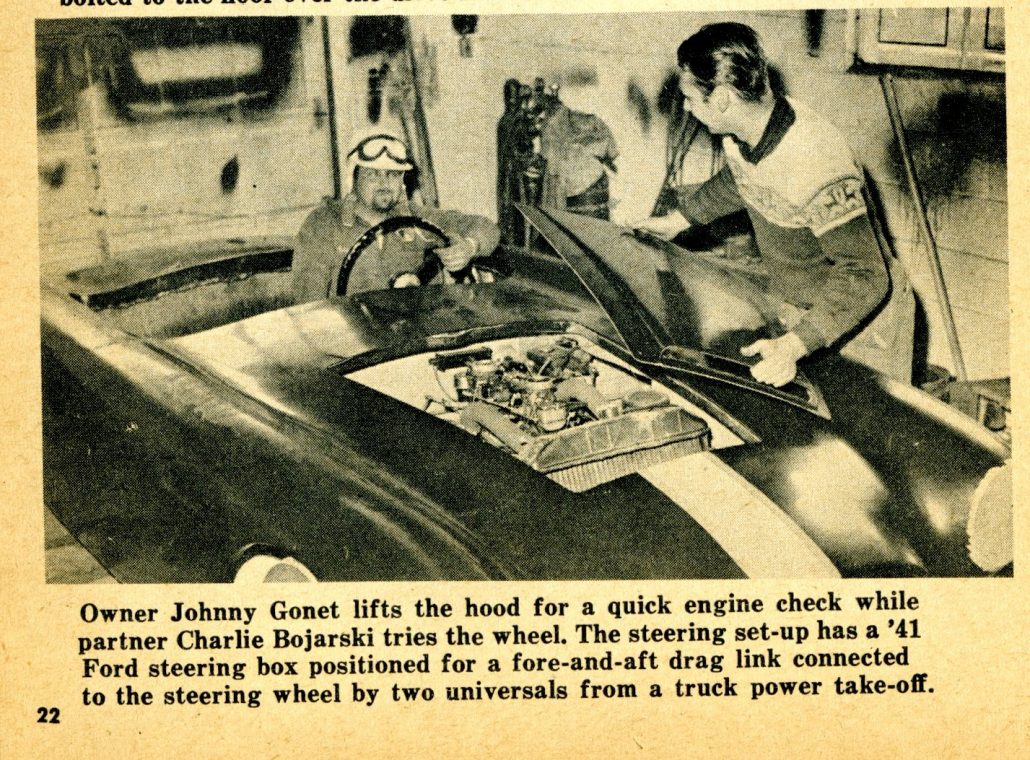 Caption: Johnny Gonet lifts the hood for a quick engine check while partner Charlie Bojarski tries the wheel. The steering set-up has a ’41 Ford steering box positioned for a fore-and-aft drag link connected to the steering wheel by two universals from a truck power take-off.