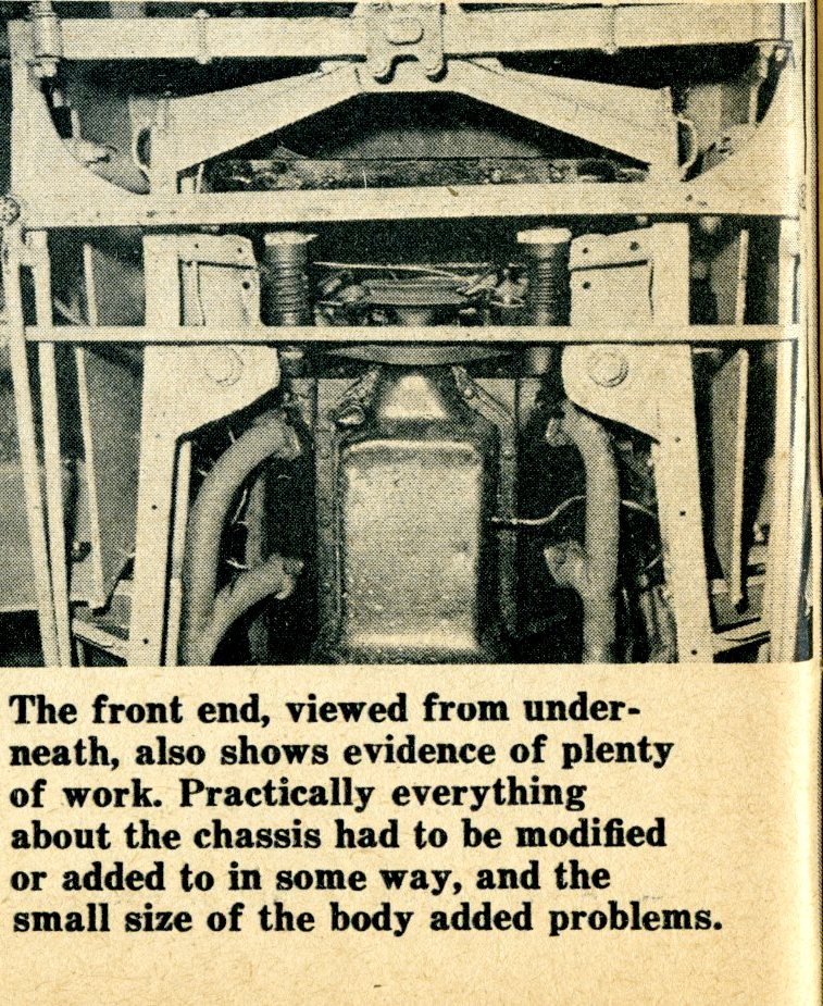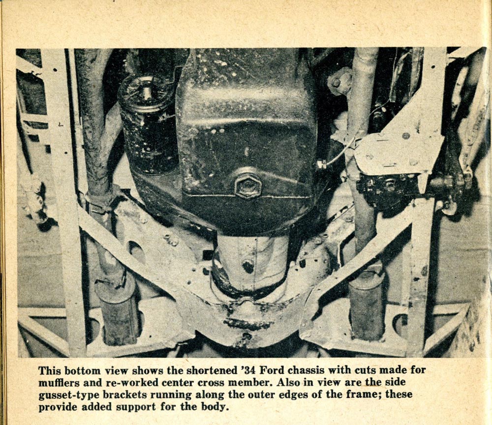 He had to cut 15 inches out of the frame and weld the shortened result back together again, but when that was finished, a major part of the labor was behind him. Next, outrigger-type brackets made of angle iron were welded to the frame and the body fitted. That may sound simple, but it too involved plenty of sweat.