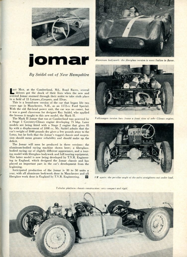 Last May, at Cumberland, Maryland Road Races, several drivers got the shock of their lives when the new and untried Jomar stormed through their midst to take sixth place in a field of 15 Lotuses, Coopers, and Elvas.