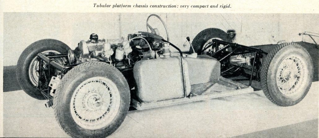 The Mark II Jomar that ran at Cumberland was powered by a Stage 1 Coventry-Climax engine developing 75 bhp. Later models are being fitted with a Stage 2 engine that gives 85 hp with a displacement of 1098 cc. Mr. Saidel admits that the car’s weight of 1040 pounds dry gives a few pounds away to the Lotus, but he feels that the Jomar’s rugged chassis and suspension should mean greater reliability and should make up the deficit.