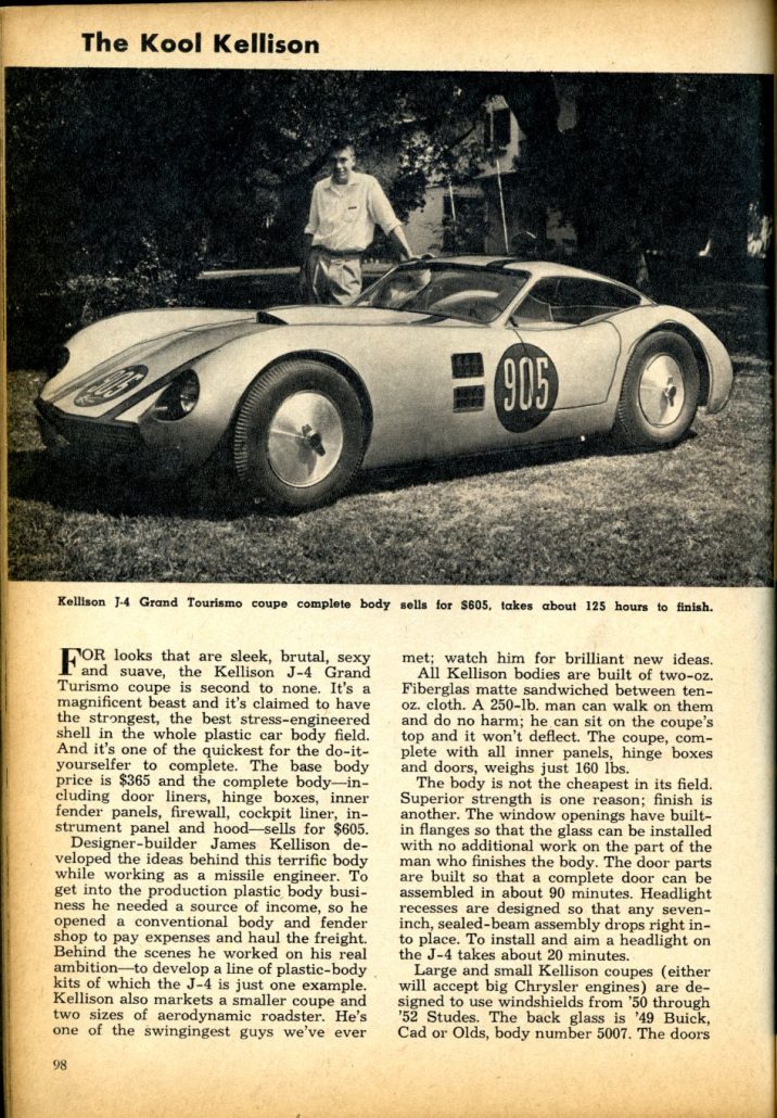 “For looks that are sleek, brutal, sexy, and suave, the Kellison J-4 Grand Turismo coupe is second to none. It’s a magnificent beast and it’s claimed to have the strongest, the best stress-engineered shell in the whole plastic car body field. And it’s one of the quickest for the do-it-yourselfer to complete. The base body price is $365 and the complete body – including door liners, hinge boxes, inner fender panels, firewall, cockpit liner, instrument panel, and hood – sells for $605.