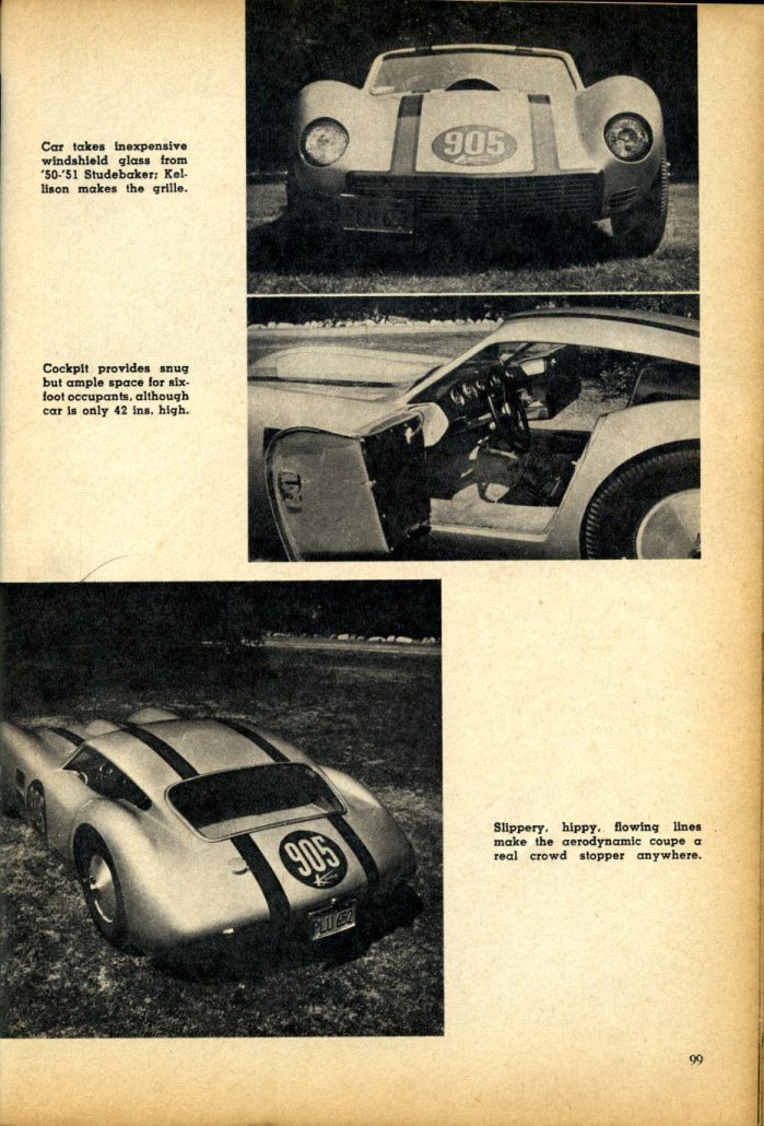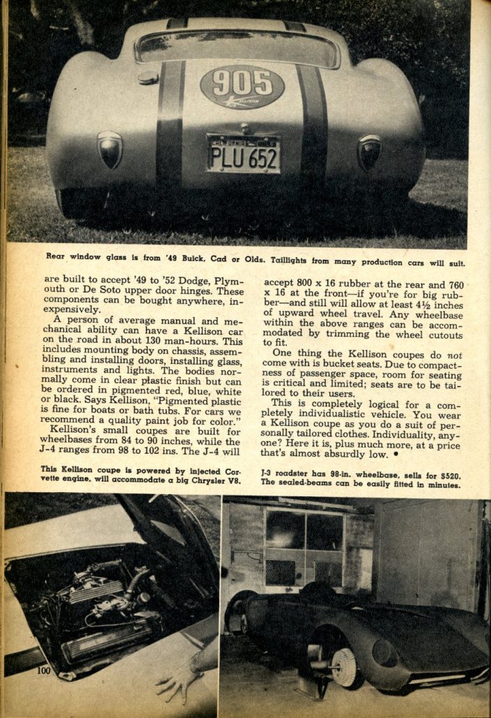 A person of average manual and mechanical ability can have a Kellison car on the road in about 130 man-hours. This includes mounting body on chassis, assembling and installing doors, installing glass, instruments, and lights. The bodies normally come in clear plastic finish but can be ordered in pigmented red, blue, white, or black. Says Kellison, “Pigmented plastic is fine for boats or bath tubs. For cars we recommend a quality paint job for color.”