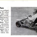 Fuel bills are low in a midget car which travels 60 to 75 miles on a gallon of gas and uses only a couple of ounces of oil a week. The open-air car has a five horsepower motor that is started with a rope. Seating two, it scoots along at 40 miles an hour. Two other models will be available soon. One will have an enclosed body, battery, generator and starter and will be powered by a 7 and ½ horsepower motor. The other will have a half body from the driver’s seat forward.