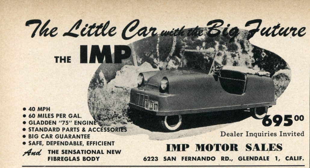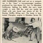 So here one year later the price has gone up to nearly $700, but it seems like a valid concept and one that may have resulted in a few sales. But….where are the California IMPs today? This is one of the earliest known fiberglass bodied cars, and was just one made – or many more? I’ve never seen a picture of one except for the articles above, and no one seems to have one in their collection of automobiles. The “mythic” like reputation of the “IMP” seems to be more appropriate than ever.
