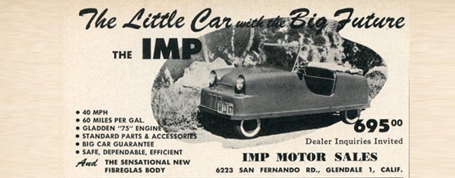 Our search for the first fiberglass production car (or fiberglass body that was produced more than once out of the same mold) has taken many twists and turns over the years, as we try and nail down the first “production” or “repeated” fiberglass bodied sports car produced. Our search for this mythical “first fiberglass car” continues to this day, so let’s add the California designed and built “IMP” to the mix. A “mythical” creature that perhaps we can shed a bit of light on in today’s story – and future stories too.