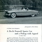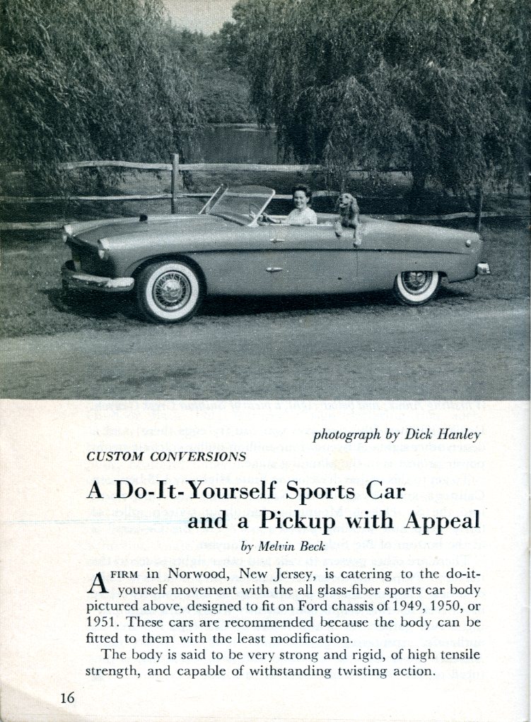 A firm in Norwood, New Jersey, is catering to the do-it-yourself movement with the all glass-fiber sports car body pictured above, designed to fit on Ford chassis of 1949, 1950, or 1951.  These cars are recommended because the body can be fitted to them with the least modification.