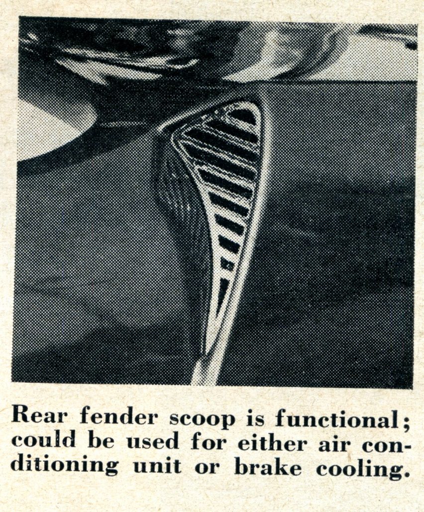 Most interesting feature in the styling of the car, besides the sculptured look that is especially apparent when you study the side view, is McCormack’s use of horizontal and vertical bars that form a pleasing, modern pattern in the grille, the fender scoops, and the rear end treatment.