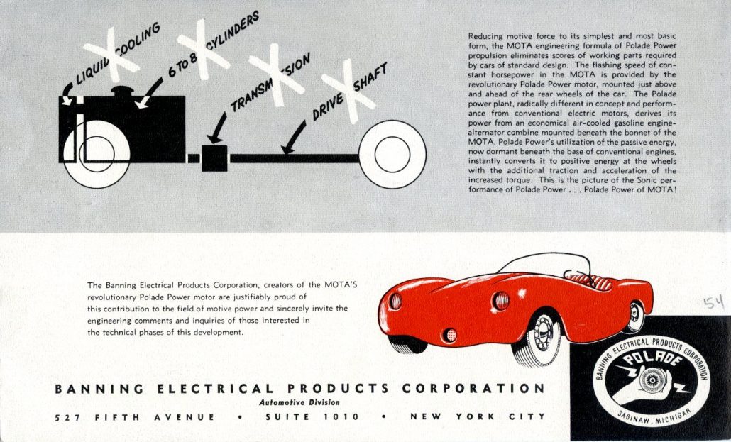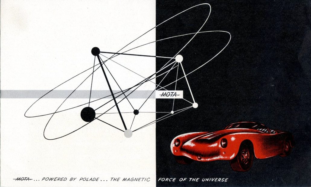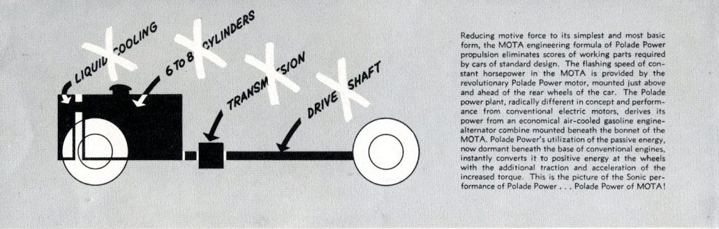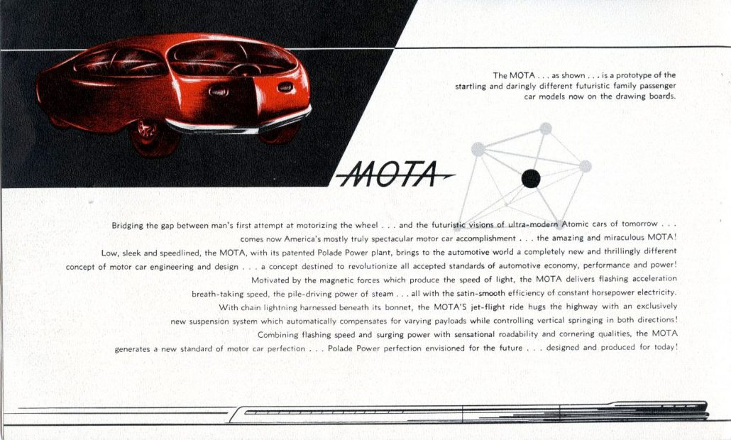 Low, sleek, and speedlined, the MOTA, with its patented Polade Power plant, brings to the automotive world a completely new and thrillingly different concept of motor car engineering and design….a concept destined to revolutionize all accepted standards of automotive economy, performance, and power!