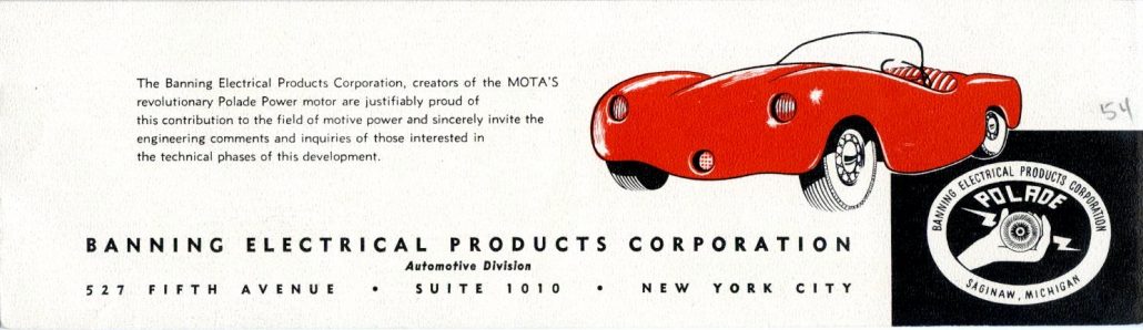 This is the first of a multi-part story on the “Mota” electric car by Banning Electrical Products Corporation of New York. Click here to review the first part of the story on the “Mota” Glasspar Electric Car.