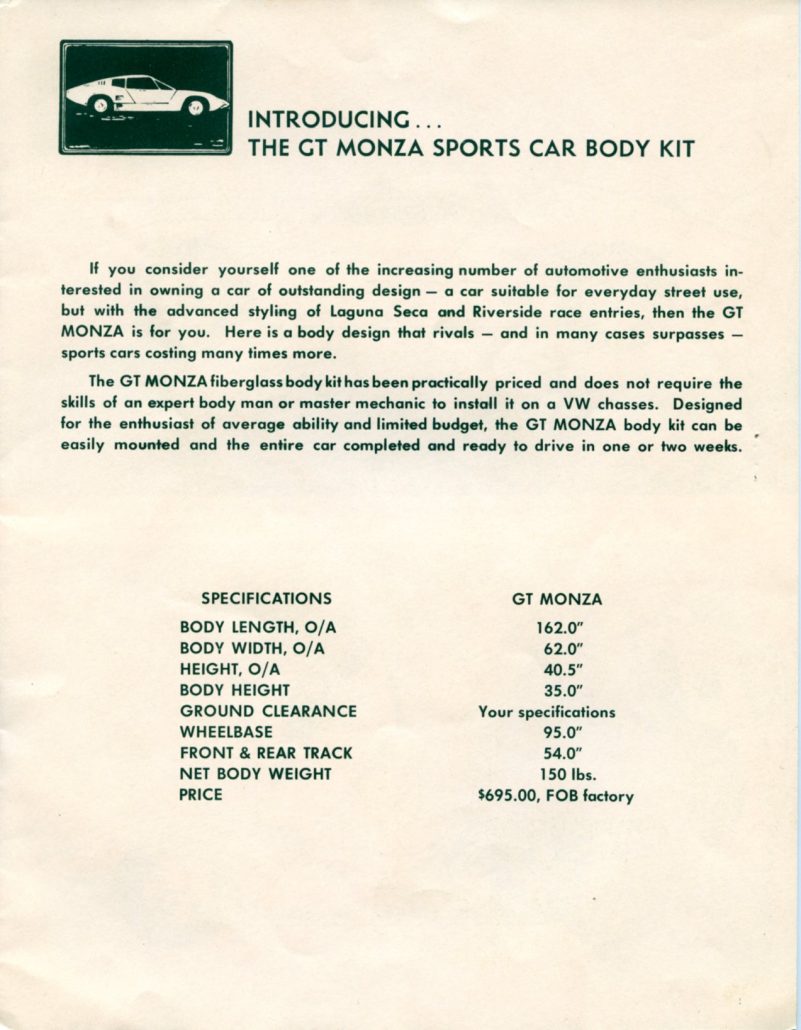 3. So I recently came across what appears to be a large 2 sheet blueprint of the GT-2 body laid over the Volkswagen chassis from a side profile view. The pages together are almost 4 feet long and shows the drawing to be 1/4 scale. It lists all the deminsions of the body and the chassis. There is a third page with the steps broken out of how to mount the body. These were my grandfathers and I’m getting them framed now to protect them.