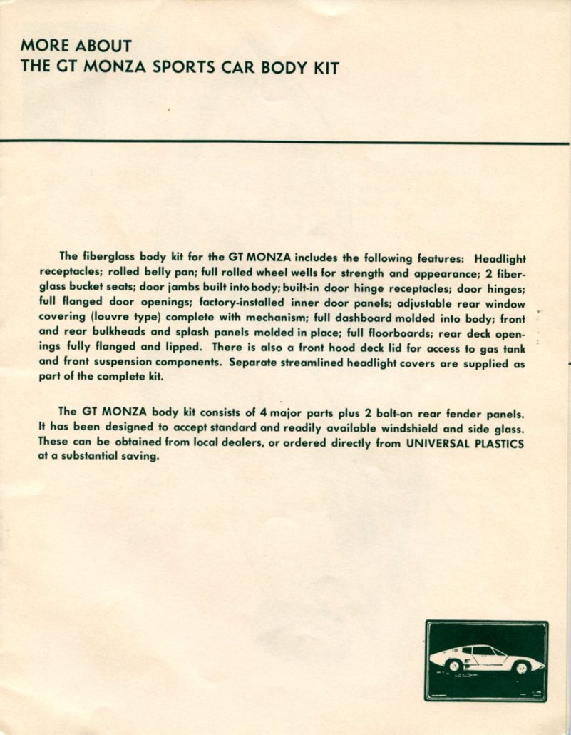 Then, two years ago (2009) as I was hauling a car up from San Jose I saw a rather decrepit GT Monza on a trailer heading North on 880! I got a very good look at the car, enough to confirm it was indeed a very old replica of the Monza GT. Unfortunately I lost it in heavy traffic, but I can confirm that Universal Plastics made at least one “GT Monza”!