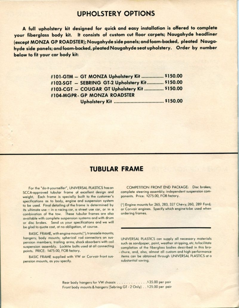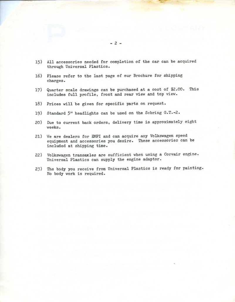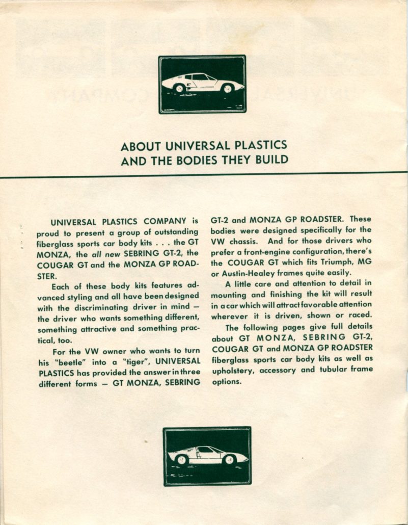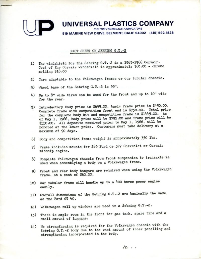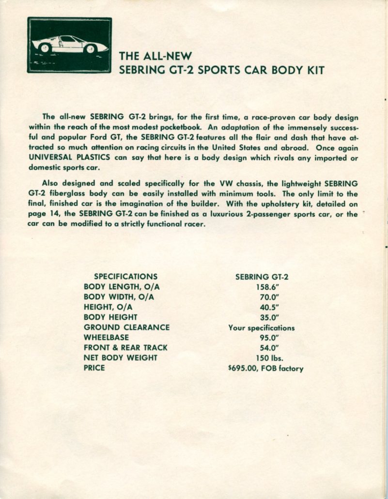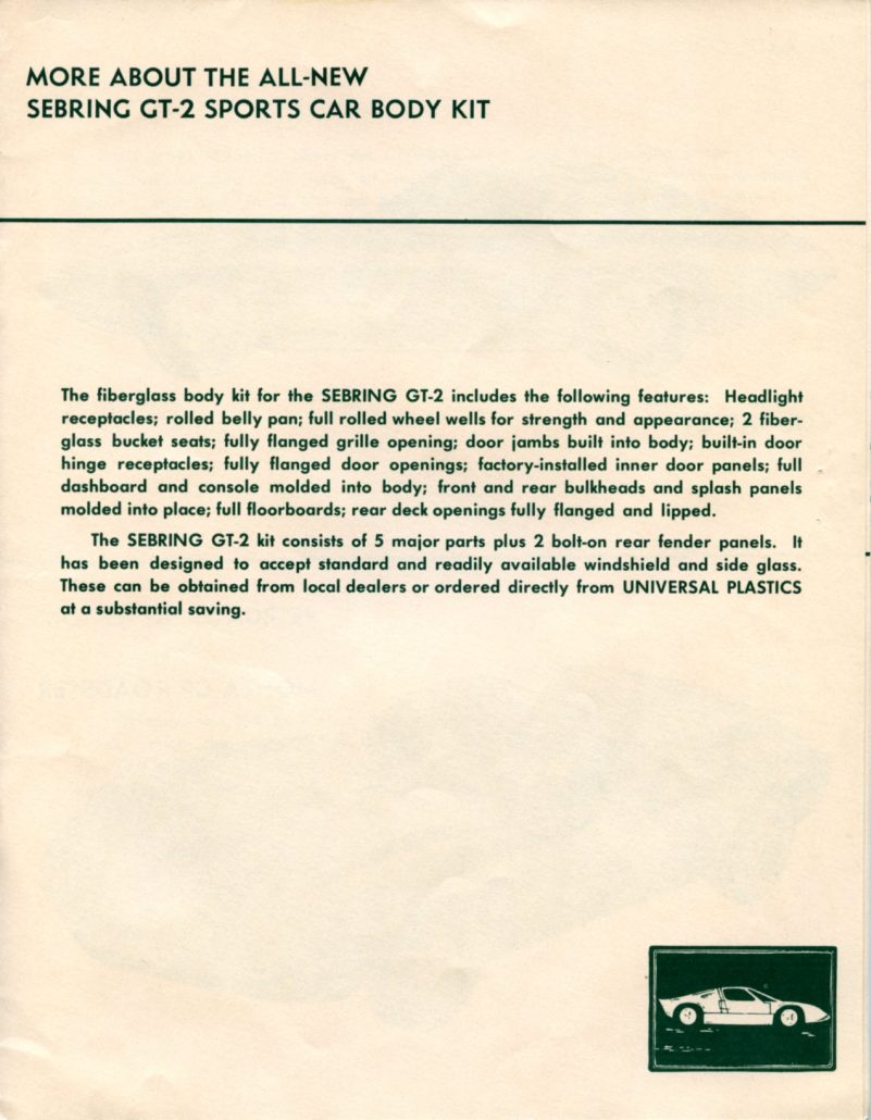 The brochure shown in the gallery of pictures is the first of the brochures produced by Universal Plastics, well designed, and professionally printed.   A letter included in the brochure dates it to early 1966 – the same time the ad appeared in Road and Track in March 1966.  An 8×10 glossy picture of a finished car was slipped inside the brochure with the caption, “Sebring GT-2 by Universal Plastics.”  By golly, they actually may have made a car or two.  It certainly is starting to look like it from the brochures and picture available from Art’s collection.
