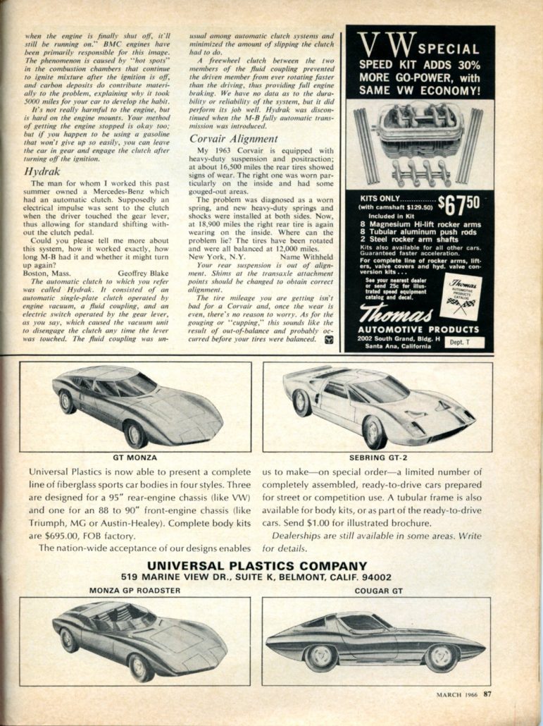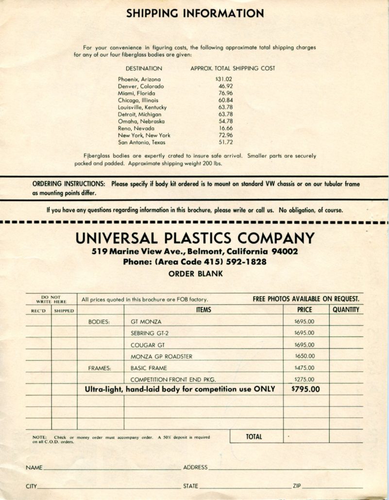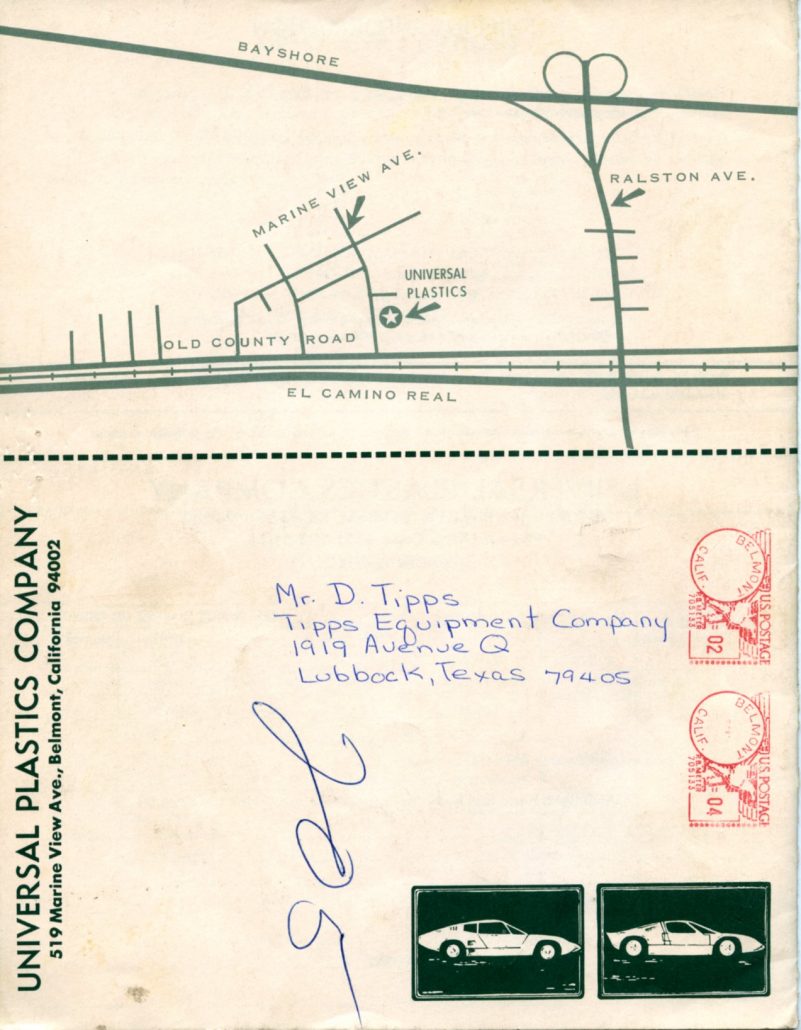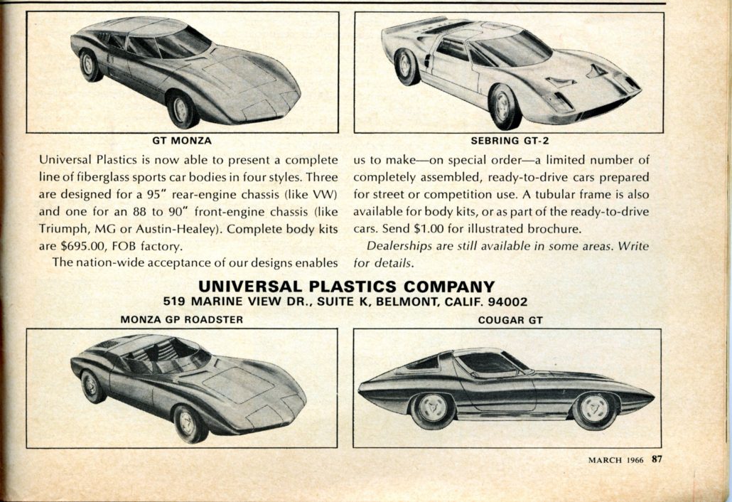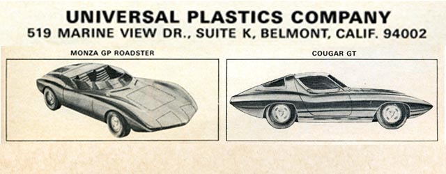 I collect old car magazines and was familiar with the Universal Plastics ad. Imagine my surprise when I moved to Oakland California and saw the exact same logo on a building facing I-880 (just North of the Colosseum). I called the company but no one remembered their years in the fiberglass car business (this was around 2000). The building has since been sold and the ad painted over.