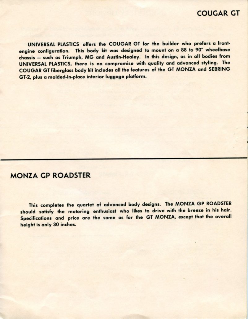 The Cougar GT By Universal Plastics Was Their Only Design For A Front-Engine Car, And Was Designed To Mount On An 88″ to 90″ Wheelbase Chassis Such as a Triumph, MG, and/or Austin-Healey.