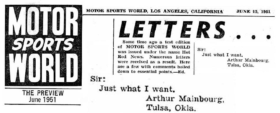 As I was reviewing the premier edition of an early newspaper called “Motor Sports World” – June 1951 – I found Art’s comments in the “letters to the editor” section.  Art was just 20 years old, and he wrote in at the thrilling aspect of having a weekly newspaper dedicated to sports cars, hot rods, and dry lakes racing.  Art was noted as saying in the premier edition of this newspaper: