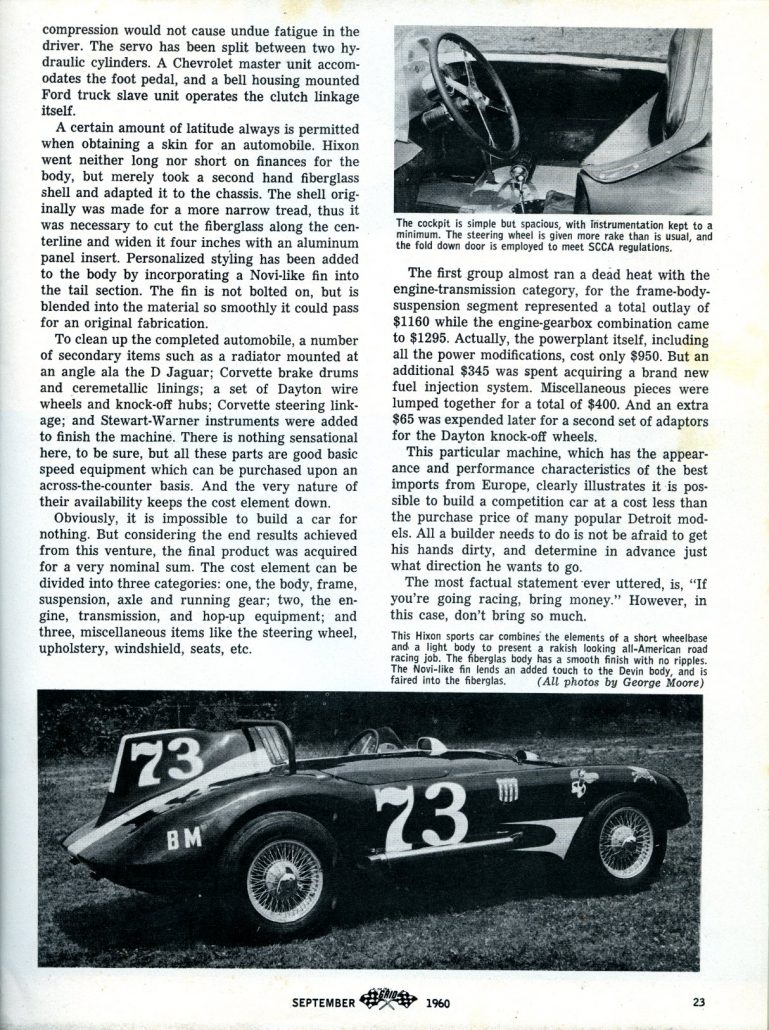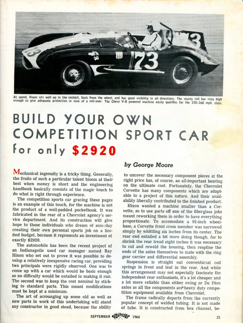 Building your own sports car that could compete as well as handle nicely on the road was something many young men dreamed of. By 1960, this was getting harder and harder to do, but Ray Hixon of Indianapolis, Indiana did it – and the story was covered in great detail in “On The Grid” Magazine in September 1960.