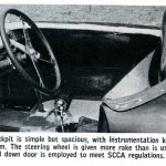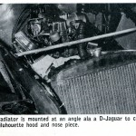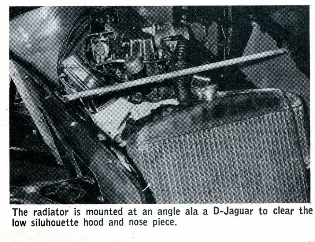 To clean up the completed automobile, a number of secondary items such as a radiator mounted at an angle ala the D Jaguar; Corvette brake drums and ceremetallic linings; a set of Dayton wire wheels and knock-off hubs; Corvette steering linkage; and Stewart-Warner instruments were added to finish the machine.