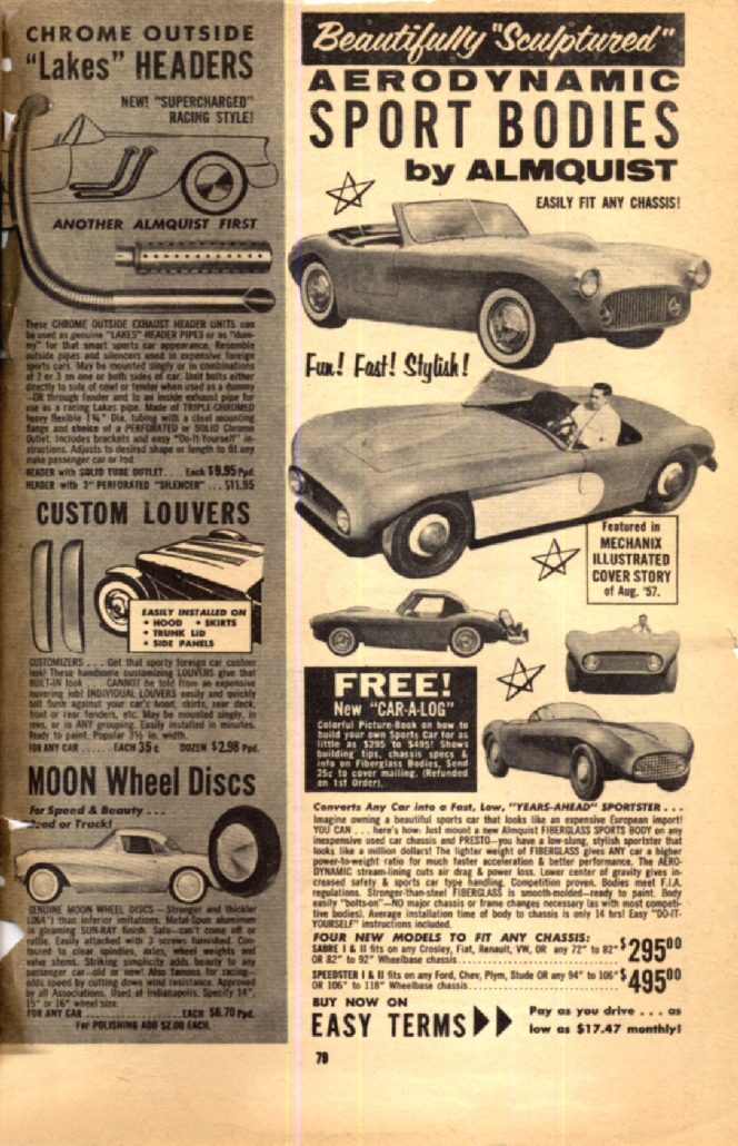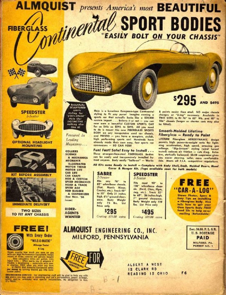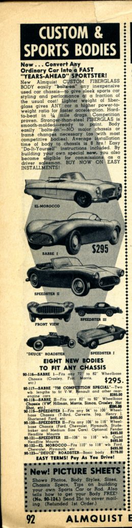In ’59, Almquist Engineering was now selling the bodies originally designed and sold by Harry Heim of Clearfield Plastics. And Harry was working with Ed Almquist to expand the bodies available for purchase. In fact, at the time Roger bought his 100” wheelbase body called an “Almquist Speedster,” they were offering two of the smaller bodies called “Sabre I” and “Sabre II” and three versions of the “Speedster” body. Roger chose the 100” wheelbase known as the “Speedster” model, and planned to use a Henry J frame to begin his build.