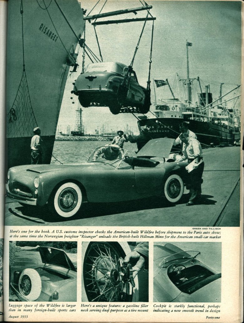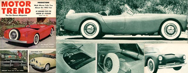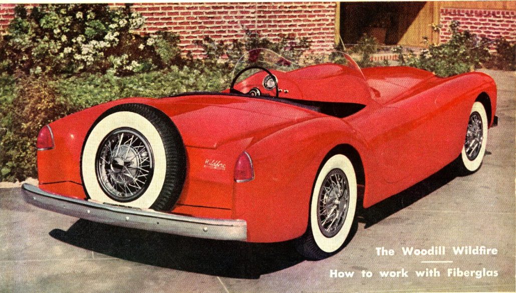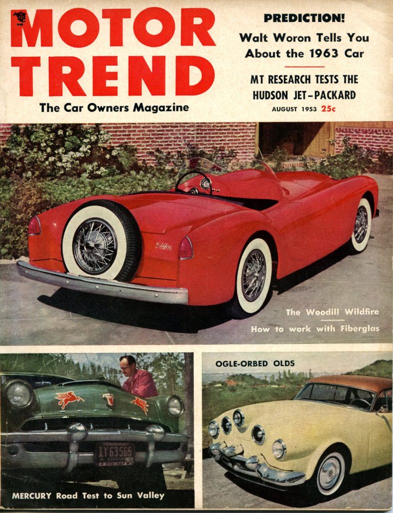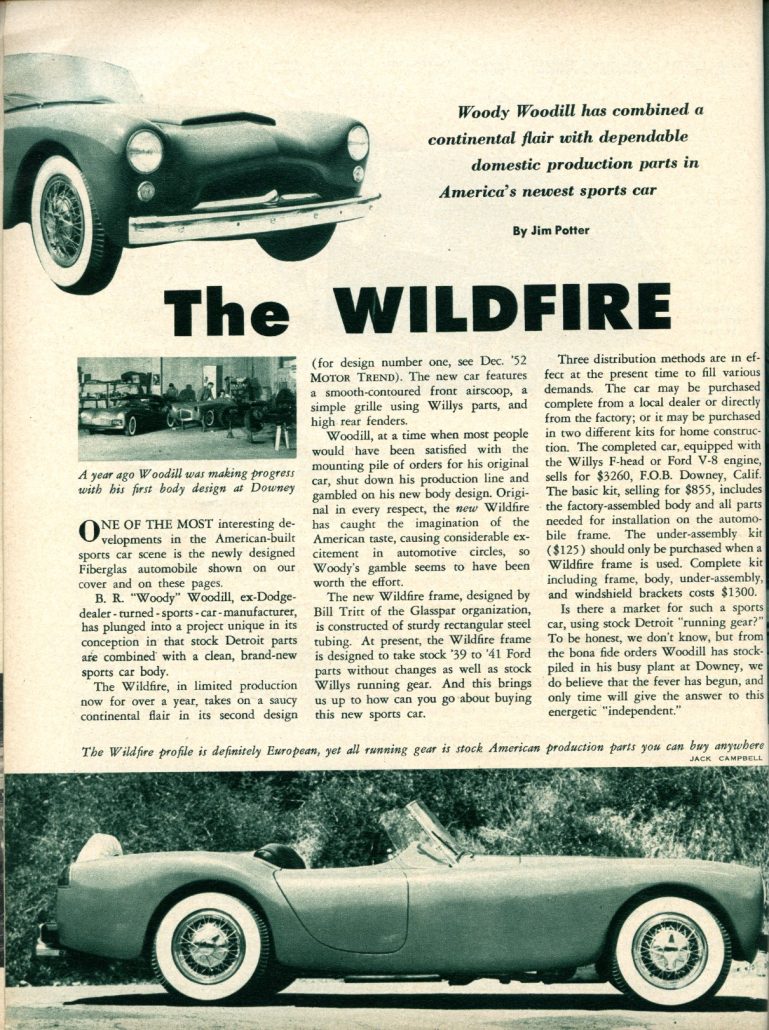 Today’s story is about the first full article on the newly designed Woodill Wildfire. This article appeared in the August 1953 issue of Motor Trend – just 2 weeks after the debut of the new Woodill Wildfire in Motor World, so this Motor Trend article represents the “birth” of what all of us vintage fiberglass sports car guys know as the Series 2 Woodill Wildfire sports car.