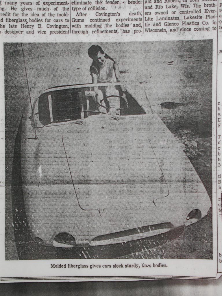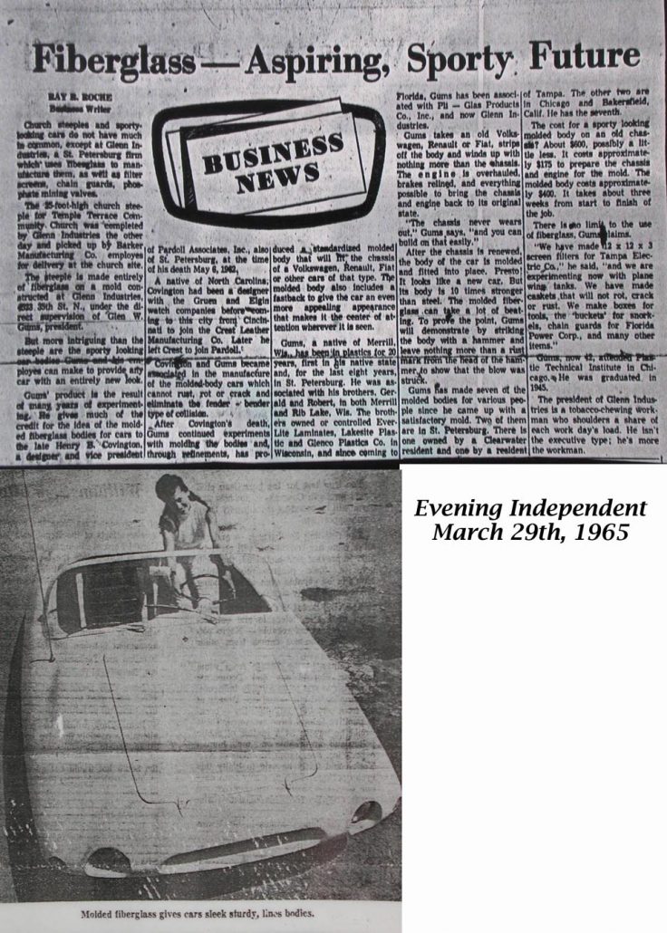 Gums’ product is the result of many years of experimenting. He gives much of the credit for the idea of the molded fiberglass bodies for cars to the late Henry B. Covington, a designer and vice president of Pardoll Associates, Inc., also of St. Petersburg, at the time of his death May 6th, 1962