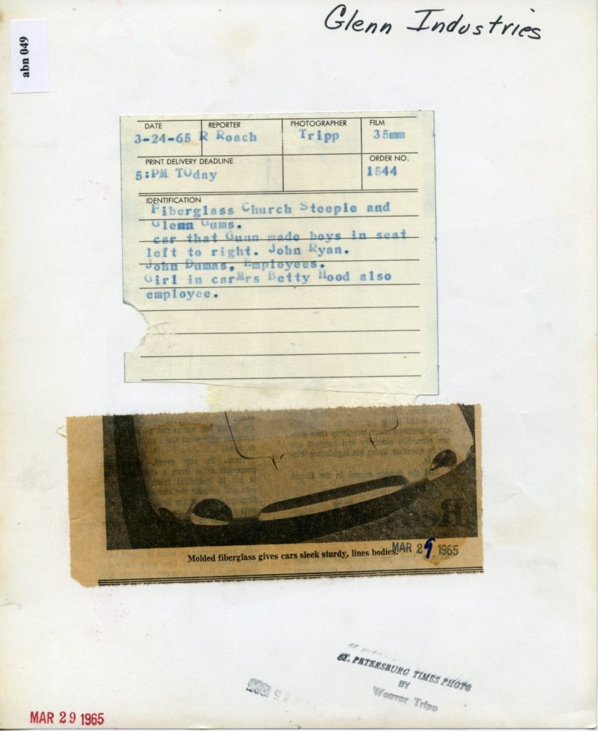 Church steeples and sporty-looking cars do not have much in common, except at Glenn Industries, a St. Petersburg firm which used fiberglass to manufacture them, as well as filter screens, chain chards, and phosphate mining valves. The 25 foot high church steeple was completed by Glenn Industries the other day and picked up by Barker Manufacturing Company employee for delivery at the church site.