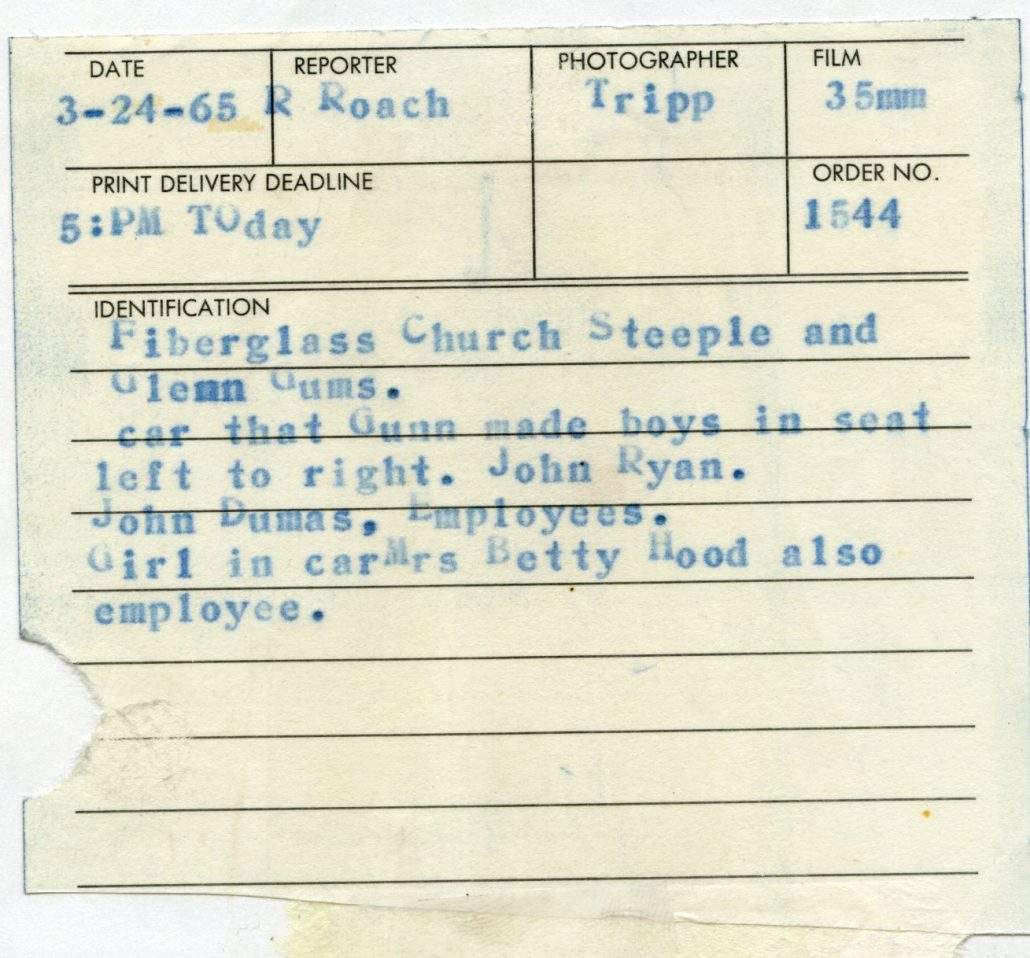 The steeple is made entirely of fiberglass on a mold constructed at Glenn Industries, 4523, 35th Street North, under the direct supervision of Glenn W. Gums, president. But more intriguing than the steeple are the sporty looking car bodies Gums and his employees can make to provide any car with an entirely new look.