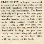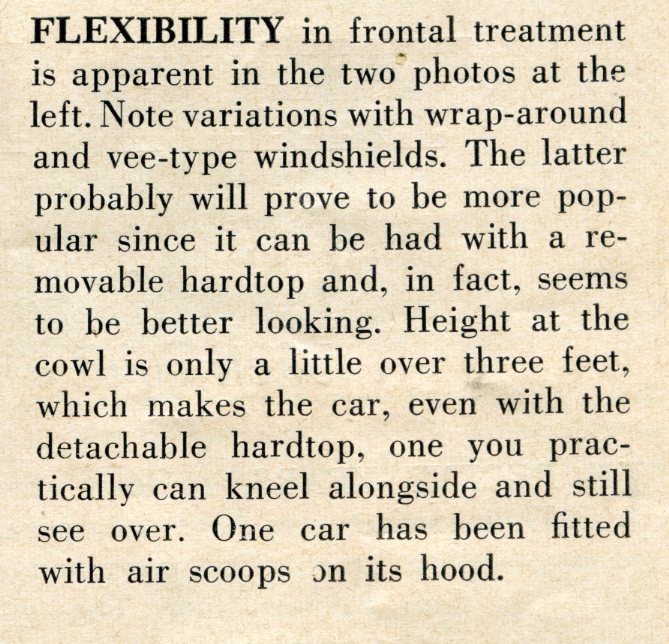 Flexibility in frontal treatment is apparent in the two photos below. Note variations with wrap-around and vee-type windshields. The latter probably will prove to be more popular since it can be had with a removable hardtop and, in fact, seems to be better looking.