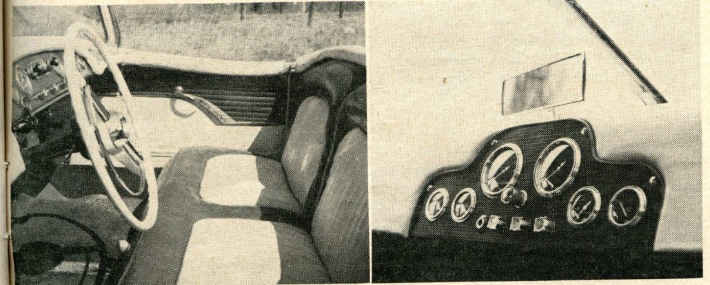 The car is a genuine custom, normally built to a customer’s specifications, so generalizations on its details are difficult. The wheelbase runs about 110 inches, with overall length from 200 to 210. The price, complete, is in the $3500 bracket, with the fiberglass body alone available for around $1250. Choices in exterior colors, interior trim, instrument panels and accessories are practically unlimited.