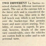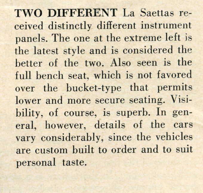 Two different La Saettas received distinctly different instrument panels. The one at the extreme left is the latest style and is considered the better of the two. Also seen is the full bench seat, which is not favored over the bucket-type that permits lower and more secure seating.