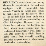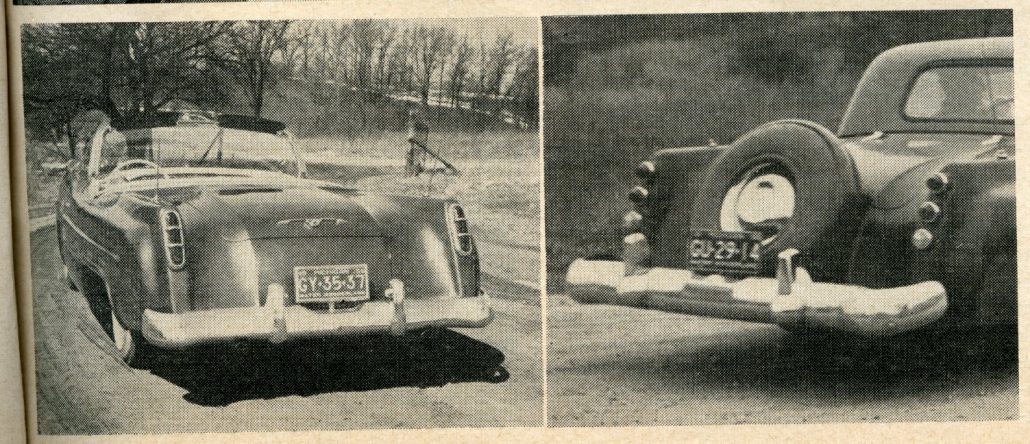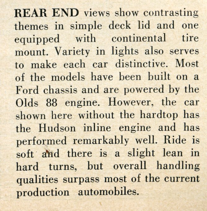 Rear end views show contrasting themes in simple deck lid and one equipped with continental tire mount. Variety in lights also serves to make each car distinctive. Most of the models have been built on a Ford chassis and are powered by the Olds 88 engine.