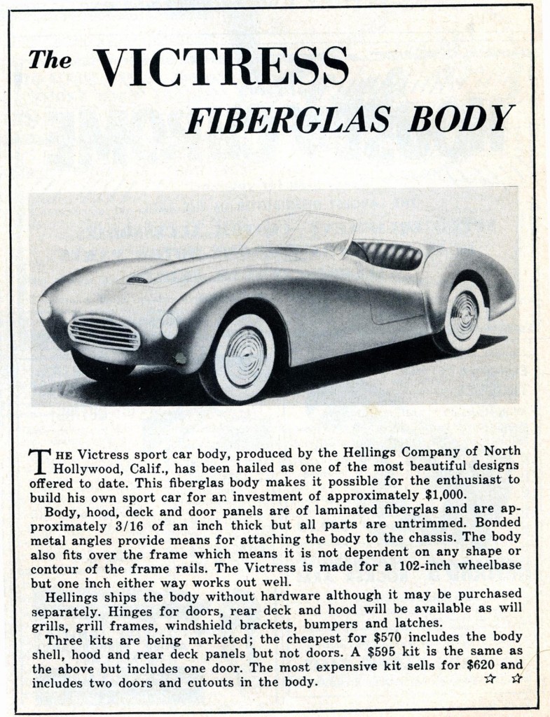 The Victress sport car body, produced by the Hellings Company of North Hollywood, California, has been hailed as one of the most beautiful designs offered to date. This fiberglass body makes it possible for the enthusiast to build his own sport car for an investment of approximately $1000.