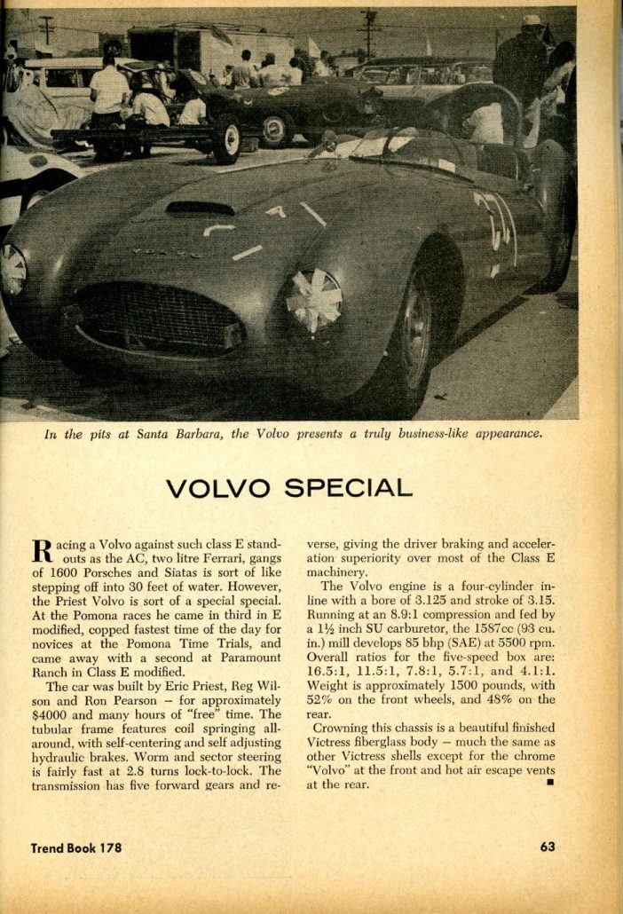 “Racing a Volvo against such class E standouts as the AC, two litre Ferrari, gangs of 1600 Porsches and Siatas is sort of like stepping off into 30 feet of water.  However, the Priest Volvo is sort of a special “special.”  At the Pomona races, he came in third in E modified, copped fastest time of the day for novices at the Pomona Time Trials, and came away with a second at Paramount Ranch in Class E modified.