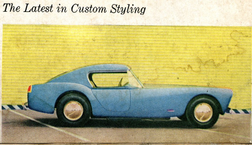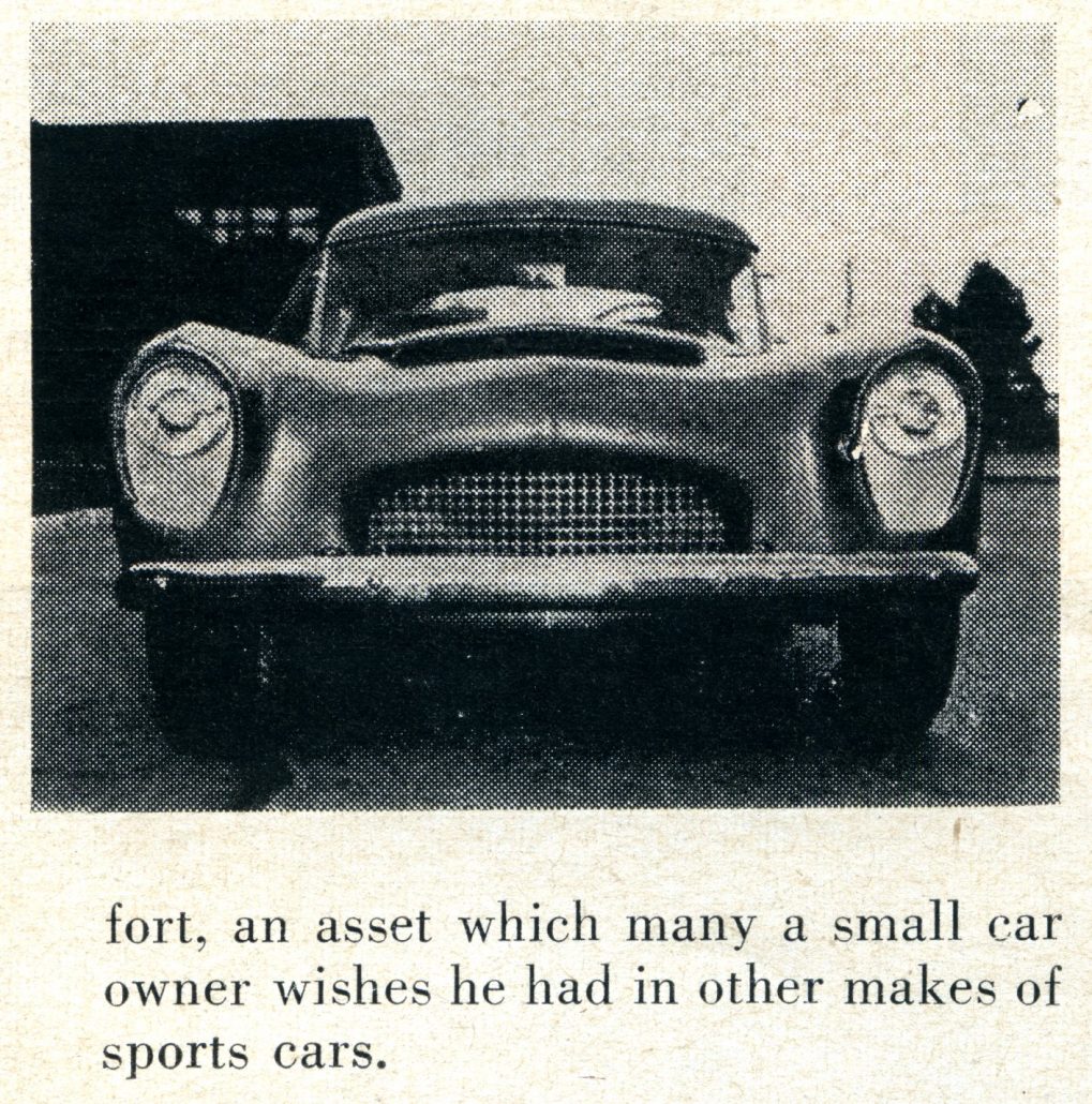 With sliding glass windows, the hardtop costs only $250 more than its roadster cousin. Taking a short spin in the coupe, I found there was ample headroom and an abundance of luggage space behind the seat. In fact, a couple of small children could easily ride back there with the simple addition of suitable padding for their comfort, an asset which many a small car owner wishes he had in other makes of sports cars.”