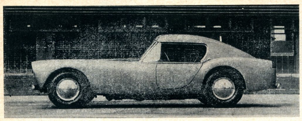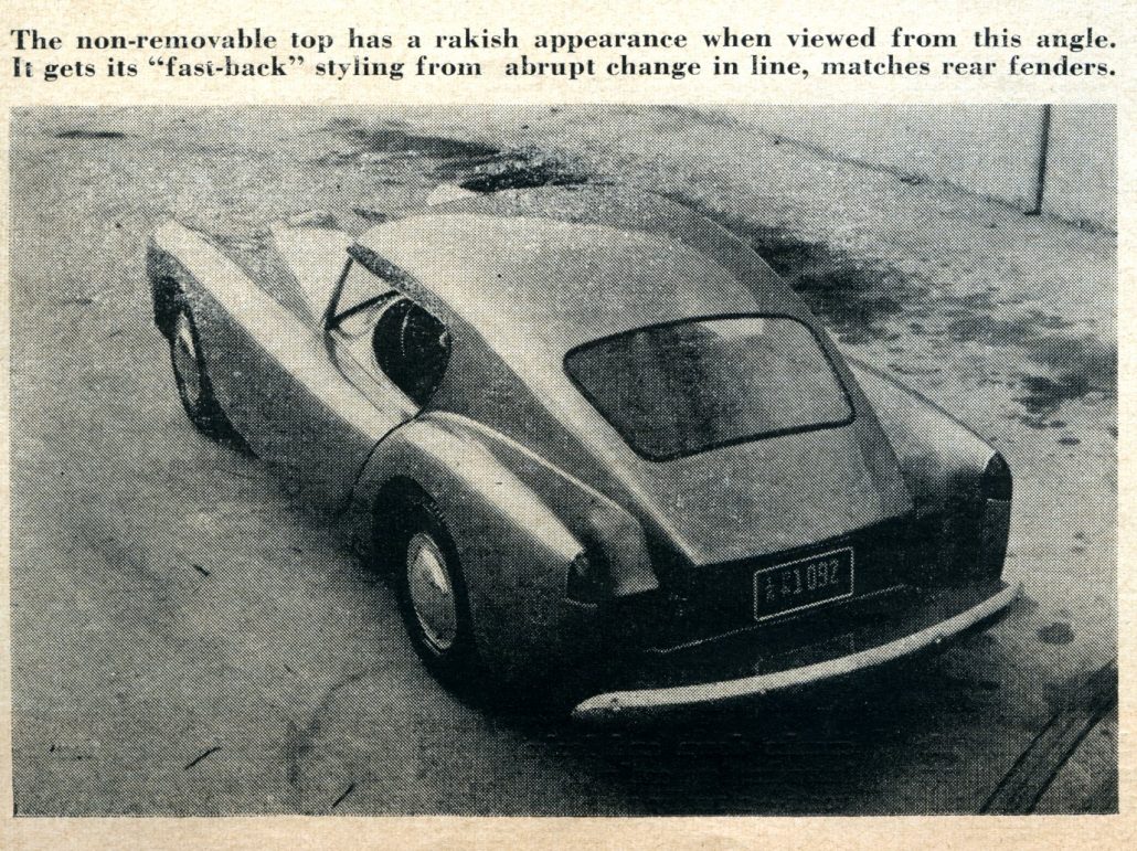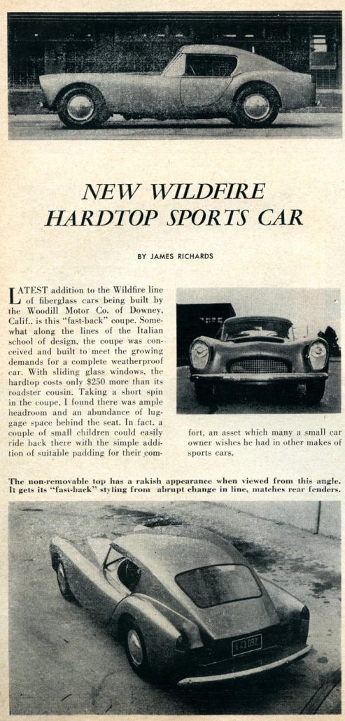 “Latest addition to the Wildfire line of fiberglass cars being built by the Woodill Motor Company of Downey, California is this “fast-back” coupe. Somewhat along the lines of the Italian school of design, the coupe was conceived and built to meet the growing demands for a complete weatherproof car.