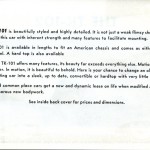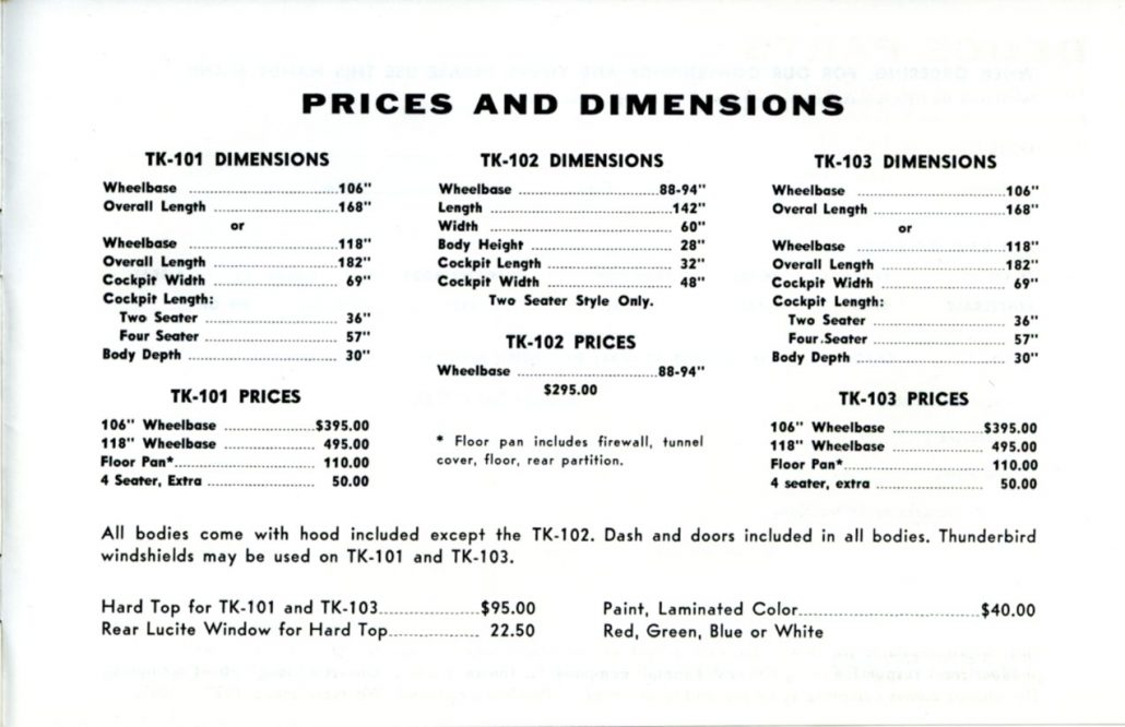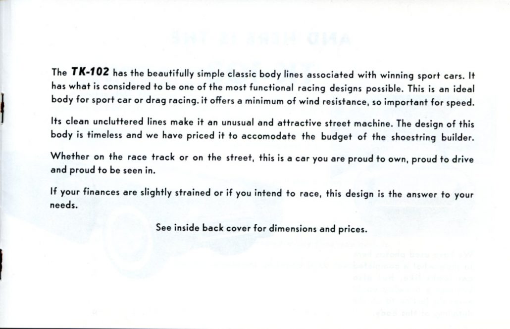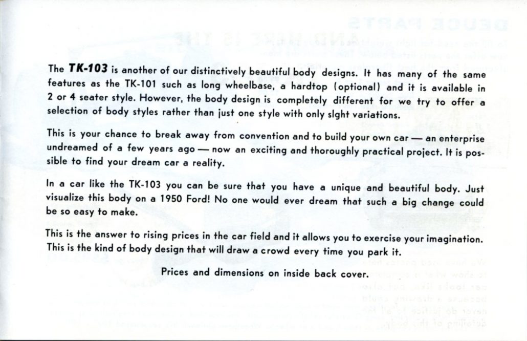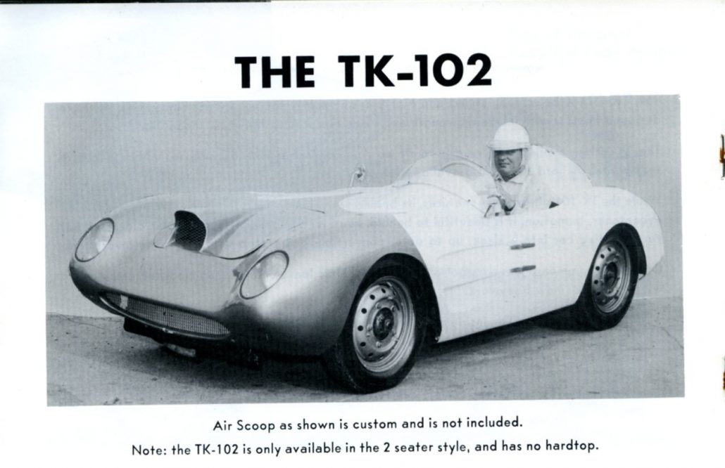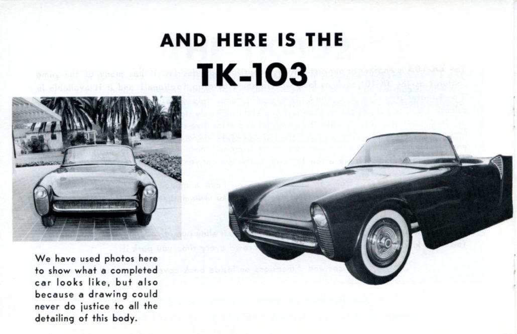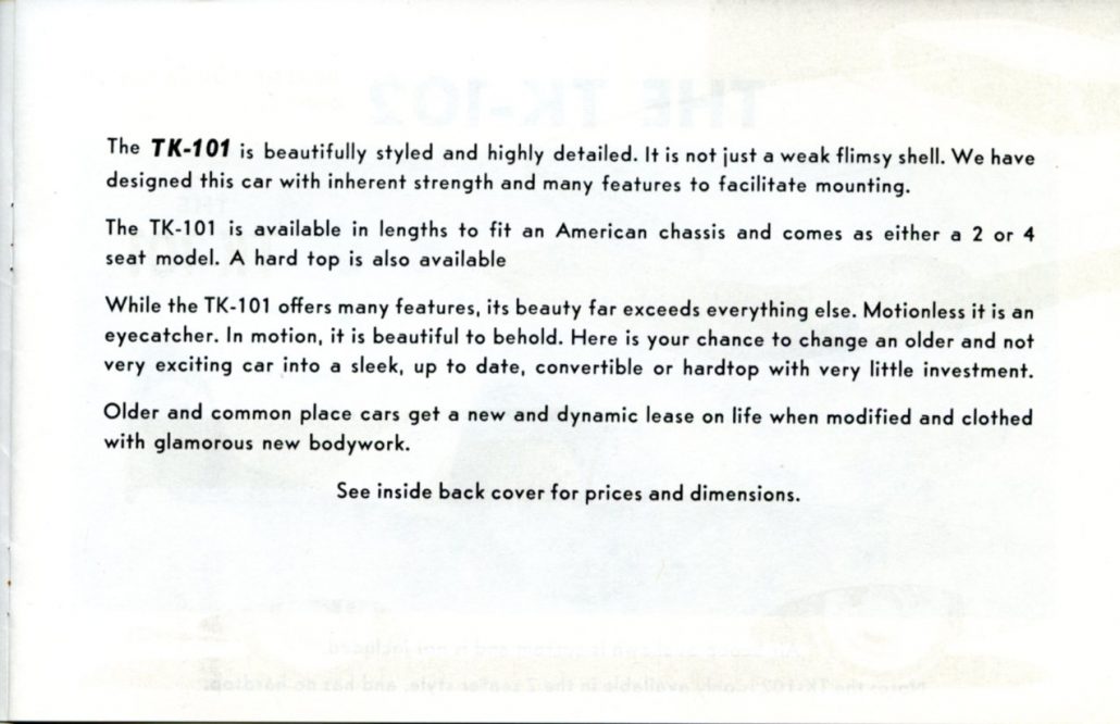 “While the TK-101 offers many features, its beauty far exceeds everything else. Motionless it is an eye catcher . In motion, it is beautiful to behold. Here is your chance to change an older and not very exciting car into a sleek, up to date, convertible or hardtop with little investment. Older and common place cars get a new and dynamic lease on life when modified and clothed with glamorous new bodywork.”